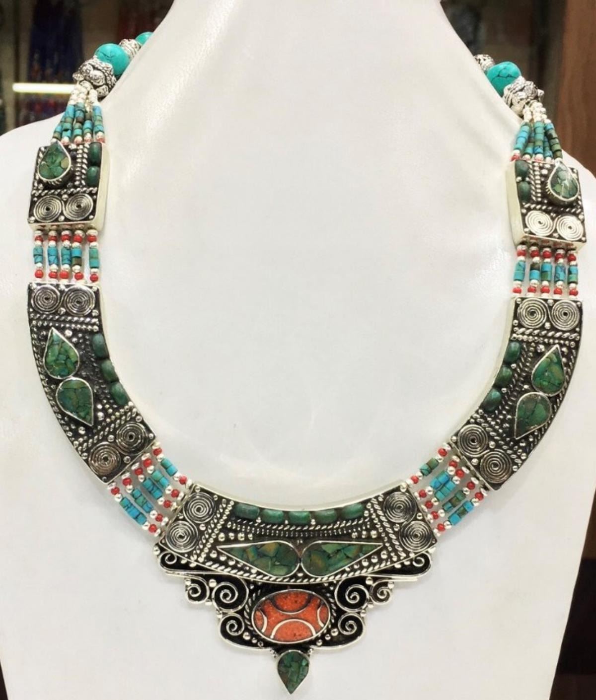 Tibet Natural Stone Hand Made Turquoise, Coral Necklace.......This elegant large Necklace was handcrafted in Tibet, the home of exquisite jewelry craftsmanship. It was skillfully made with large natural Turquoise, each in a deep Tibetan Silver setting. and balance the design perfectly. Turquoise is used virtually worldwide for jewelry making, and is highly prized for its brilliant colors, which vary from mine to mine. The distinctive webbing patterns and variations of color in the stones on this wonderful piece are typical of the natural Turquoise found throughout much of the Himalayan region, where Turquoise has been used in jewelry-making since centuries.”””Note- All stones in this necklace are Natural.....Guranteed....Vintage look but necklace is brand new.