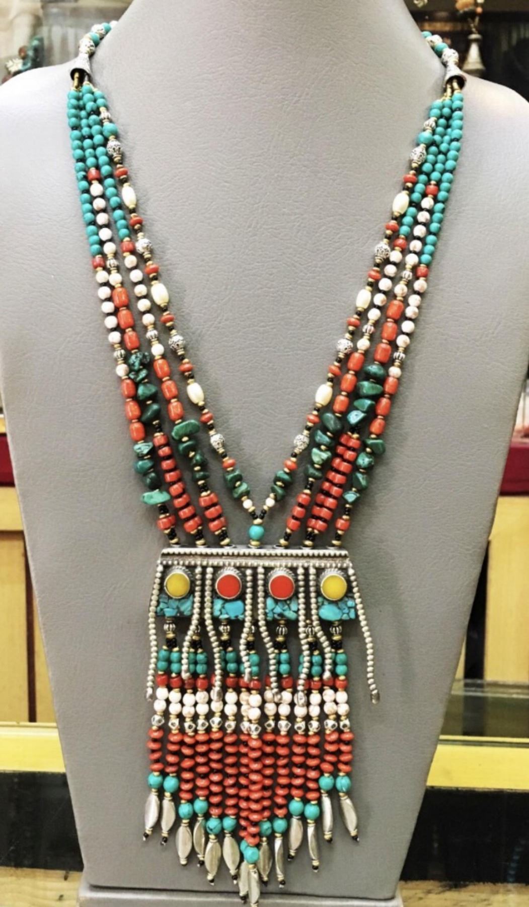 Tibet Natural Stone Hand Made Turquoise, Coral Necklace.......This elegant large Necklace was handcrafted in Tibet, the home of exquisite jewelry craftsmanship. It was skillfully made with large natural Turquoise, each in a deep Tibetan Silver setting. and balance the design perfectly. Turquoise is used virtually worldwide for jewelry making, and is highly prized for its brilliant colors, which vary from mine to mine. The distinctive webbing patterns and variations of color in the stones on this wonderful piece are typical of the natural Turquoise found throughout much of the Himalayan region, where Turquoise has been used in jewelry-making since centuries.”””Note- All stones in this necklace are Natural.....Guranteed....Vintage look but necklace is brand new.