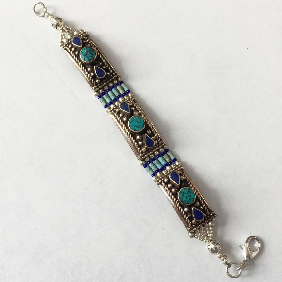Tibet Natural Stone Hand Made lapiz lazuli & Turquoise Bracelet.......This elegant large Bracelet was handcrafted in Tibet, the home of exquisite jewelry craftsmanship. It was skillfully made with natural Lapiz Lazuli, each in a deep Tibetan Silver setting. and balance the design perfectly. Turquoise is used virtually worldwide for jewelry making, and is highly prized for its brilliant colors, which vary from mine to mine. The distinctive webbing patterns and variations of color in the stones ..Vintage look but Bracelet is brand new.