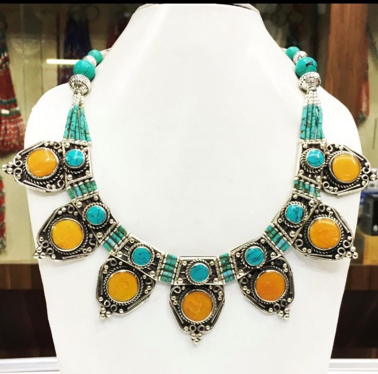 Tibet Natural Stone Hand Made Turquoise Necklace.......This elegant large Necklace was handcrafted in Tibet, the home of exquisite jewelry craftsmanship. It was skillfully made with large natural Turquoise, each in a deep Tibetan Silver setting. and balance the design perfectly. Turquoise is used virtually worldwide for jewelry making, and is highly prized for its brilliant colors, which vary from mine to mine. The distinctive webbing patterns and variations of color in the stones on this wonderful piece are typical of the natural Turquoise found throughout much of the Himalayan region, where Turquoise has been used in jewelry-making since centuries.”””Note- All stones in this necklace are Natural.....Guaranteed....Vintage look but necklace is brand new.