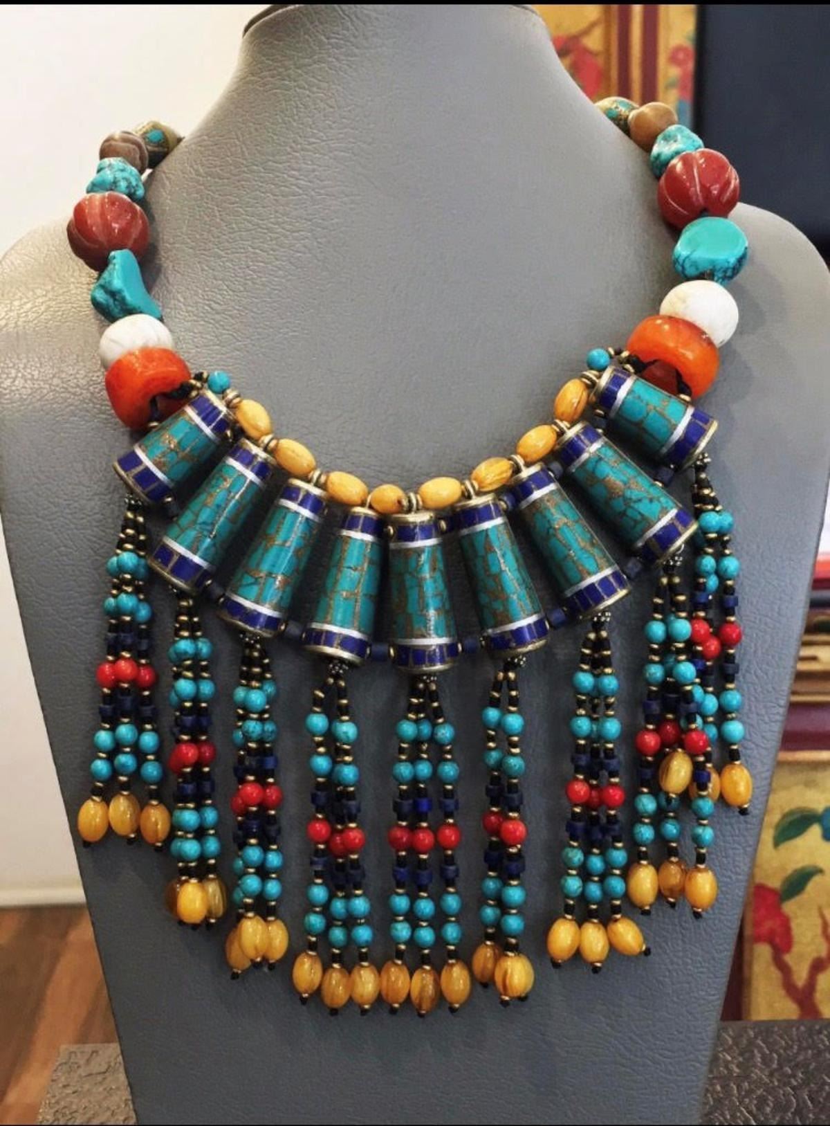 Tibet Natural Stone Hand Made Turquoise, Coral Necklace & Lapiz Lazuli.......This elegant large Necklace was handcrafted in Tibet, the home of exquisite jewelry craftsmanship. It was skillfully made with large natural Turquoise, each in a deep Tibetan Silver setting. and balance the design perfectly. Turquoise is used virtually worldwide for jewelry making, and is highly prized for its brilliant colors, which vary from mine to mine. The distinctive webbing patterns and variations of color in the stones on this wonderful piece are typical of the natural Turquoise found throughout much of the Himalayan region, where Turquoise has been used in jewelry-making since centuries.”””Note- All stones in this necklace are Natural.....Guaranteed....Vintage look but necklace is brand new.Note- (Handcrafted/Handmade in Tibet)