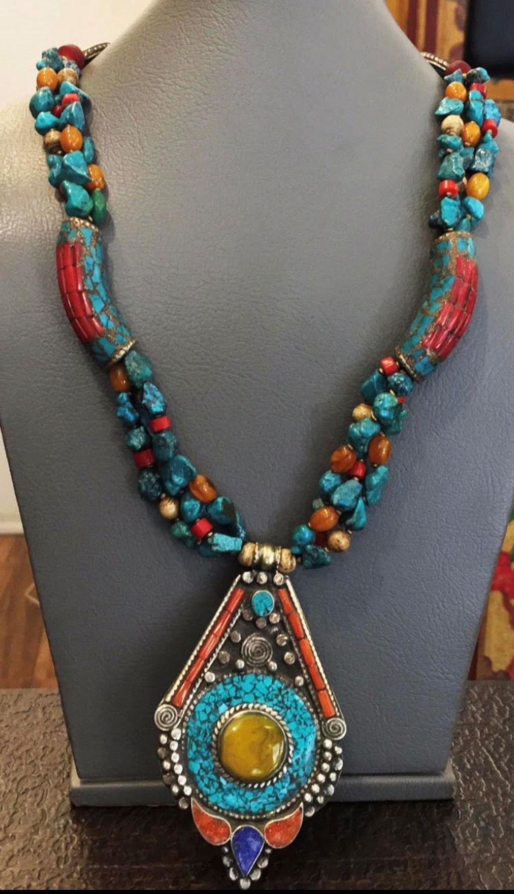 Tibet Natural Stone Hand Made Turquoise, Coral Necklace & Lapiz Lazuli.......This elegant large Necklace was handcrafted in Tibet, the home of exquisite jewelry craftsmanship. It was skillfully made with large natural Turquoise, each in a deep Tibetan Silver setting. and balance the design perfectly. Turquoise is used virtually worldwide for jewelry making, and is highly prized for its brilliant colors, which vary from mine to mine. The distinctive webbing patterns and variations of color in the stones on this wonderful piece are typical of the natural Turquoise found throughout much of the Himalayan region, where Turquoise has been used in jewelry-making since centuries.”””Note- All stones in this necklace are Natural.....Guaranteed....Vintage look but necklace is brand new.Note- (Handcrafted/Handmade in Tibet)