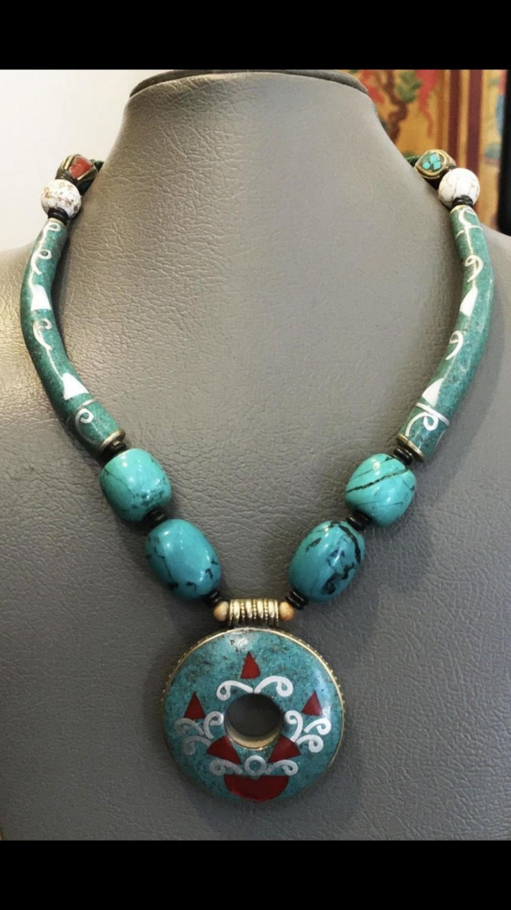 Tibet Natural Stone Hand Made Turquoise......;This elegant large Necklace was handcrafted in Tibet, the home of exquisite jewelry craftsmanship. It was skillfully made with large natural Turquoise, each in a deep Tibetan Silver setting. and balance the design perfectly. Turquoise is used virtually worldwide for jewelry making, and is highly prized for its brilliant colors, which vary from mine to mine. The distinctive webbing patterns and variations of color in the stones on this wonderful piece are typical of the natural Turquoise found throughout much of the Himalayan region, where Turquoise has been used in jewelry-making since centuries.(Handcrafted and made in Tibet)