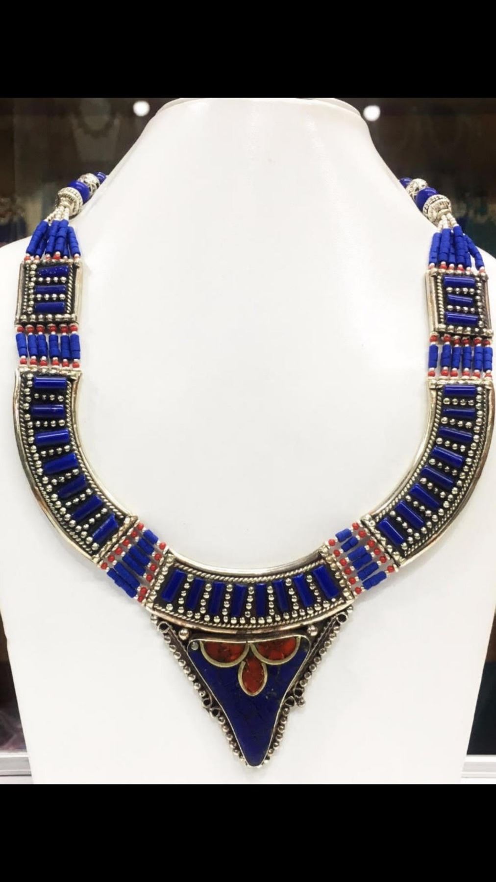 Tibet Natural Stone Hand Made Lapiz Lazuli Coral Necklace ......;This elegant large Necklace was handcrafted in Tibet, the home of exquisite jewelry craftsmanship. It was skillfully made with large natural lapiz Lazuli coral, each in a deep Tibetan Silver setting. and balance the design perfectly.”””Note- All stones in this necklace are Natural.....guaranteed....Vintage look but necklace is brand new.