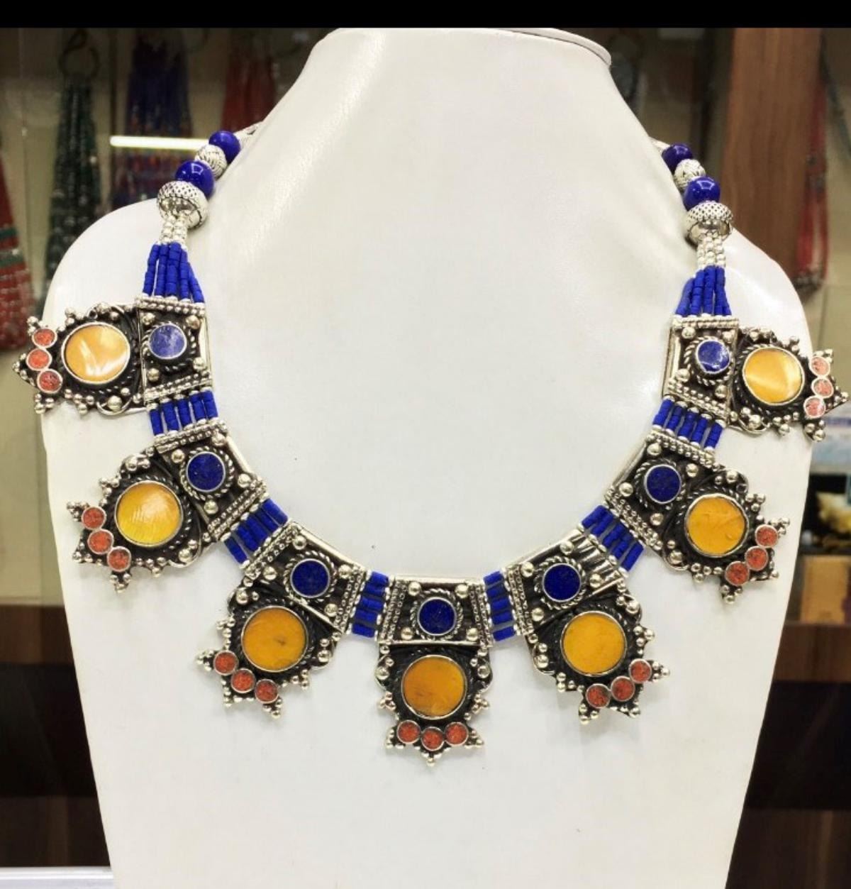 Tibet Natural Stone Hand Made Lapiz Lazuli & Coral Necklace ......;This elegant large Necklace was handcrafted in Tibet, the home of exquisite jewelry craftsmanship. It was skillfully made with large natural lapiz Lazuli & coral, each in a deep Tibetan Silver setting. and balance the design perfectly.”””Note- All stones in this necklace are Natural.....guaranteed....Vintage look but necklace is brand new.