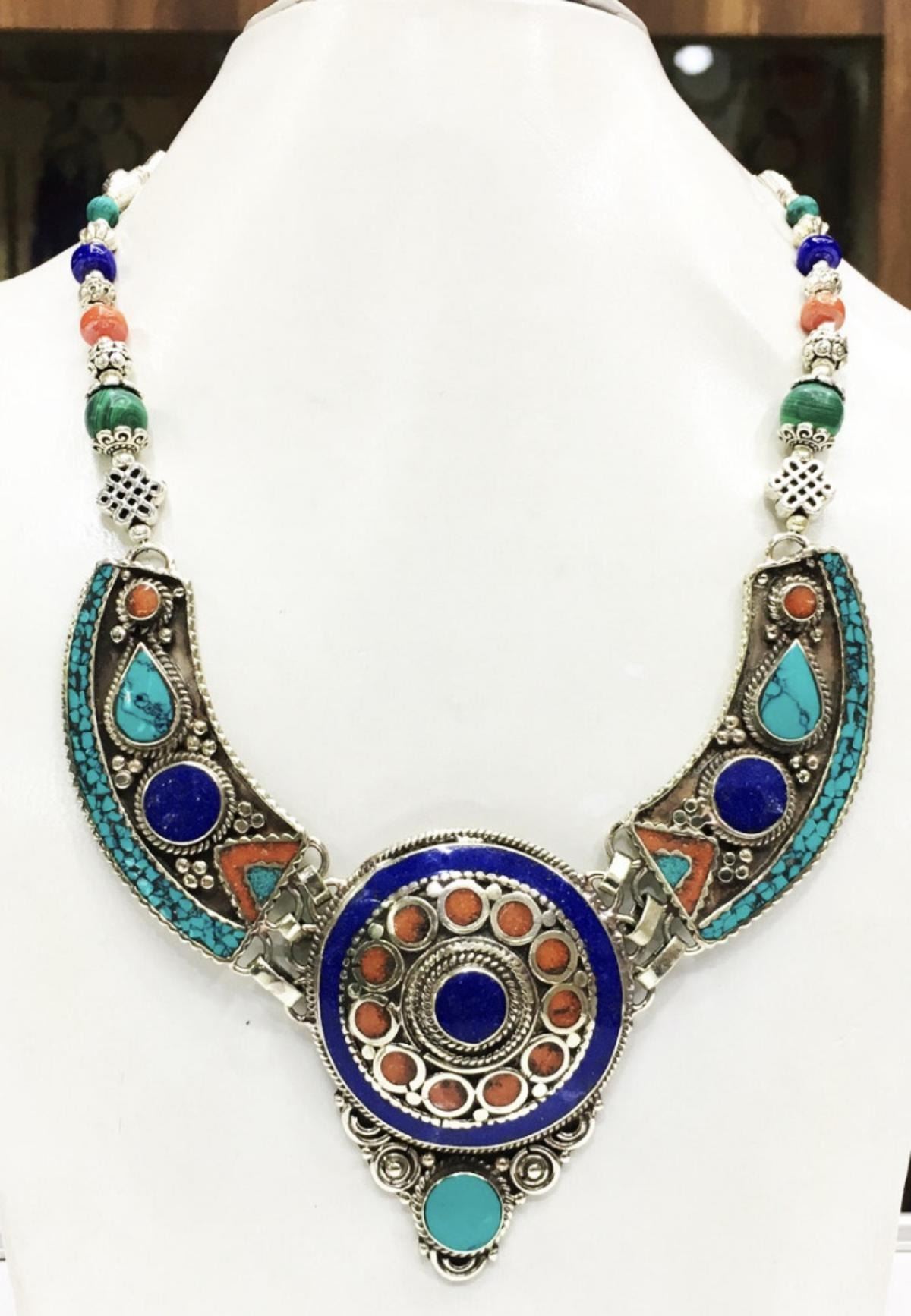 Tibet Natural Stone Hand Made Turquoise, Coral Necklace & Lapiz Lazuli.......This elegant large Necklace was handcrafted in Tibet, the home of exquisite jewelry craftsmanship. It was skillfully made with large natural Turquoise, each in a deep Tibetan Silver setting. and balance the design perfectly. Turquoise is used virtually worldwide for jewelry making, and is highly prized for its brilliant colors, which vary from mine to mine. The distinctive webbing patterns and variations of color in the stones on this wonderful piece are typical of the natural Turquoise found throughout much of the Himalayan region, where Turquoise has been used in jewelry-making since centuries.”””Note- All stones in this necklace are Natural.....Guaranteed....Vintage look but necklace is brand new.Note- (Handcrafted/Handmade in Tibet)