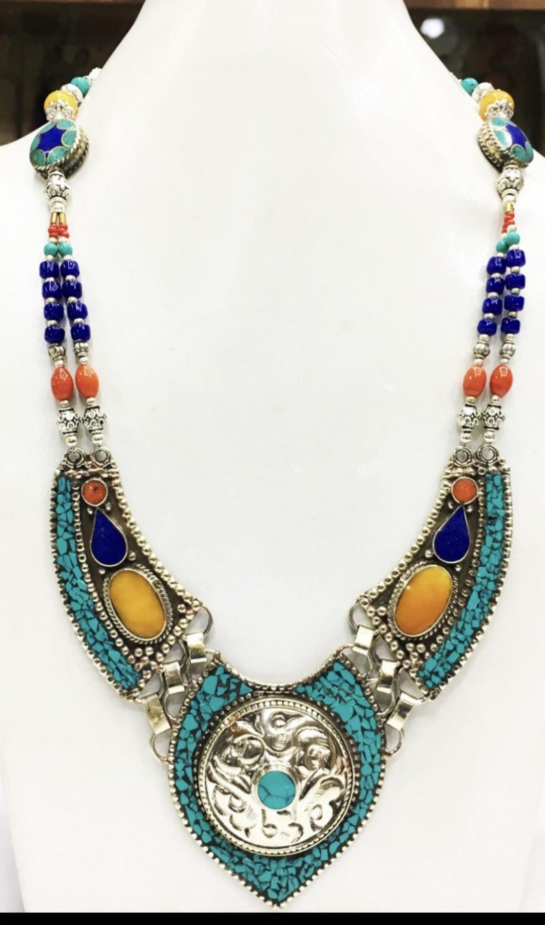 Tibet Natural Stone Hand Made Turquoise, Coral Necklace & Lapiz Lazuli.......This elegant large Necklace was handcrafted in Tibet, the home of exquisite jewelry craftsmanship. It was skillfully made with large natural Turquoise, each in a deep Tibetan Silver setting. and balance the design perfectly. Turquoise is used virtually worldwide for jewelry making, and is highly prized for its brilliant colors, which vary from mine to mine. The distinctive webbing patterns and variations of color in the stones on this wonderful piece are typical of the natural Turquoise found throughout much of the Himalayan region, where Turquoise has been used in jewelry-making since centuries.”””Note- All stones in this necklace are Natural.....Guaranteed....Vintage look but necklace is brand new.Note- (Handcrafted/Handmade in Tibet)CONDITION