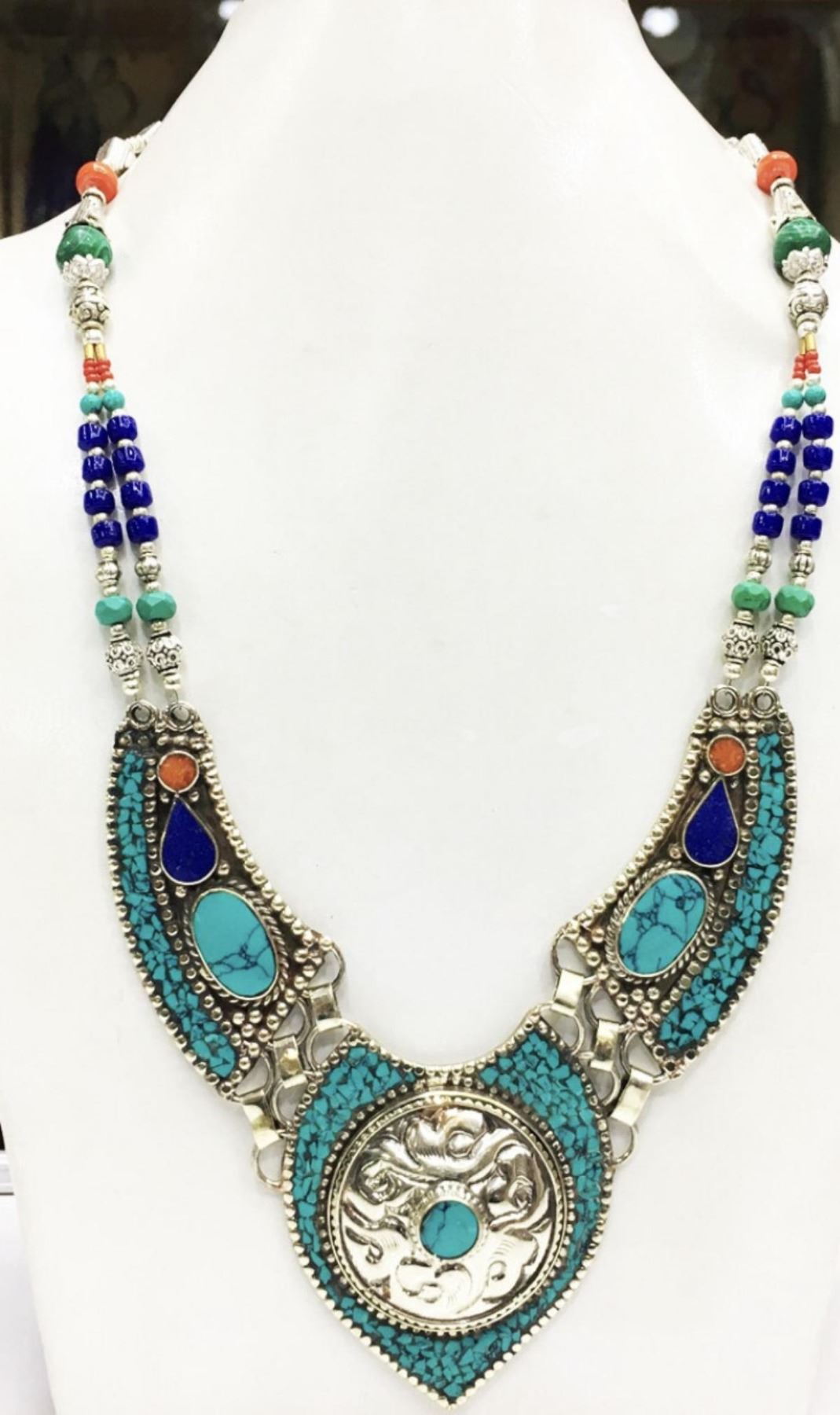 Tibet Natural Stone Hand Made Turquoise, Coral Necklace & Lapiz Lazuli.......This elegant large Necklace was handcrafted in Tibet, the home of exquisite jewelry craftsmanship. It was skillfully made with large natural Turquoise, each in a deep Tibetan Silver setting. and balance the design perfectly. Turquoise is used virtually worldwide for jewelry making, and is highly prized for its brilliant colors, which vary from mine to mine. The distinctive webbing patterns and variations of color in the stones on this wonderful piece are typical of the natural Turquoise found throughout much of the Himalayan region, where Turquoise has been used in jewelry-making since centuries.”””Note- All stones in this necklace are Natural.....Guaranteed....Vintage look but necklace is brand new.Note- (Handcrafted/Handmade in Tibet)