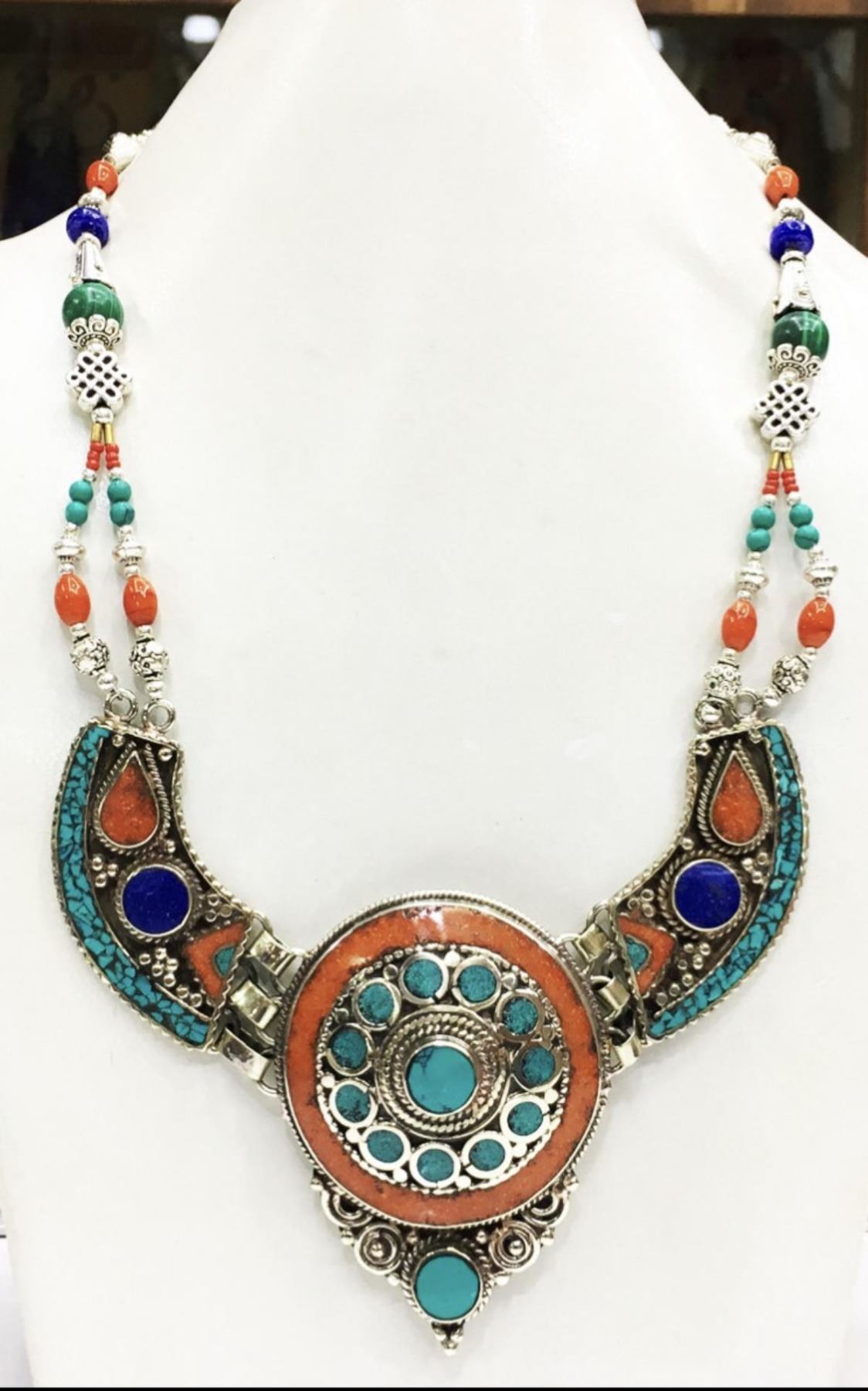 Tibet Natural Stone Hand Made Turquoise, Coral Necklace & Lapiz Lazuli.......This elegant large Necklace was handcrafted in Tibet, the home of exquisite jewelry craftsmanship. It was skillfully made with large natural Turquoise, each in a deep Tibetan Silver setting. and balance the design perfectly. Turquoise is used virtually worldwide for jewelry making, and is highly prized for its brilliant colors, which vary from mine to mine. The distinctive webbing patterns and variations of color in the stones on this wonderful piece are typical of the natural Turquoise found throughout much of the Himalayan region, where Turquoise has been used in jewelry-making since centuries.”””Note- All stones in this necklace are Natural.....Guaranteed....Vintage look but necklace is brand new.Note- (Handcrafted/Handmade in Tibet)