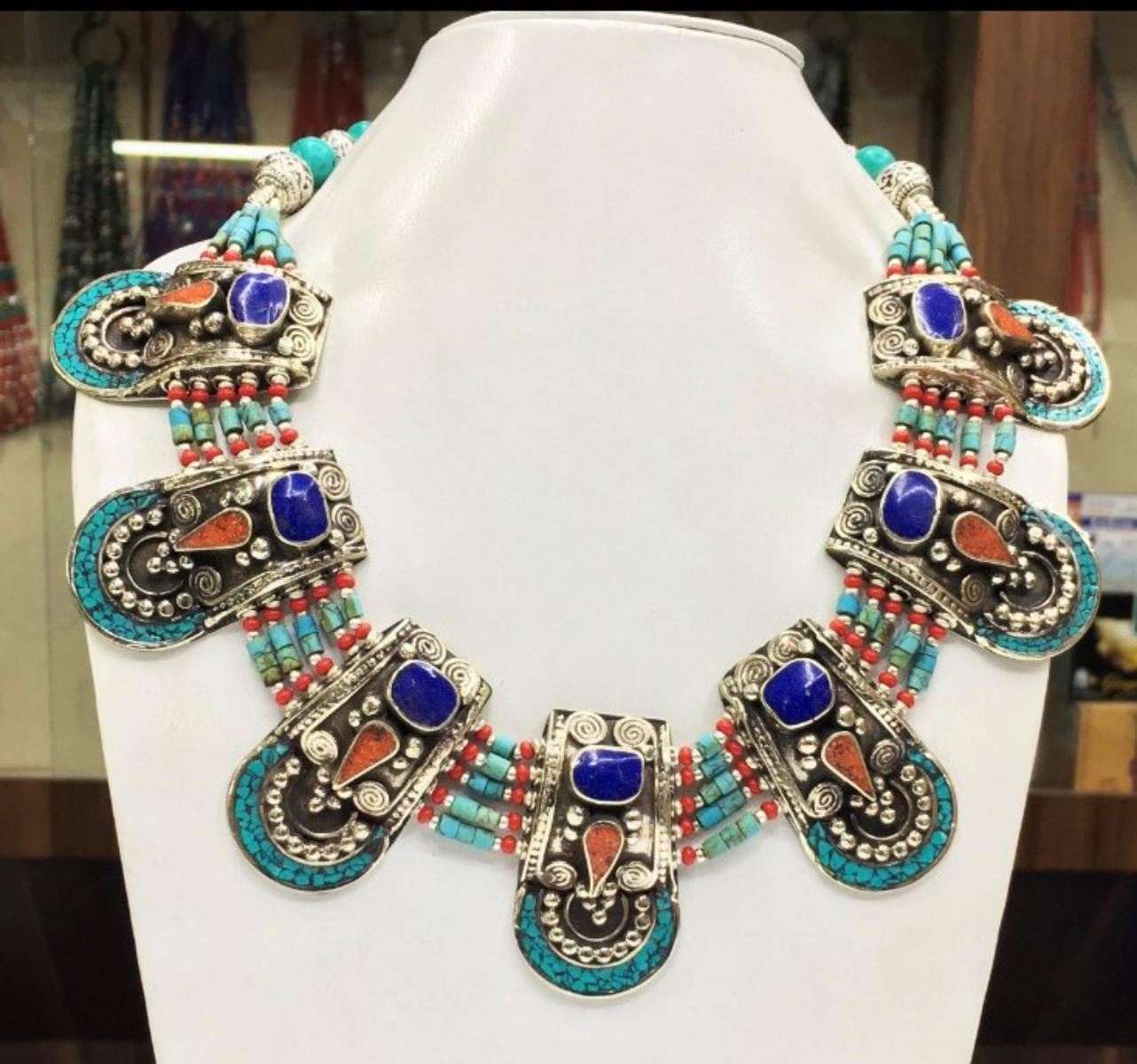 Tibet Natural Stone Hand Made Turquoise, Coral Necklace & Lapiz Lazuli.......This elegant large Necklace was handcrafted in Tibet, the home of exquisite jewelry craftsmanship. It was skillfully made with large natural Turquoise, each in a deep Tibetan Silver setting. and balance the design perfectly. Turquoise is used virtually worldwide for jewelry making, and is highly prized for its brilliant colors, which vary from mine to mine. The distinctive webbing patterns and variations of color in the stones on this wonderful piece are typical of the natural Turquoise found throughout much of the Himalayan region, where Turquoise has been used in jewelry-making since centuries.”””Note- All stones in this necklace are Natural.....Guaranteed....Vintage look but necklace is brand new.Note- (Handcrafted/Handmade in Tibet)