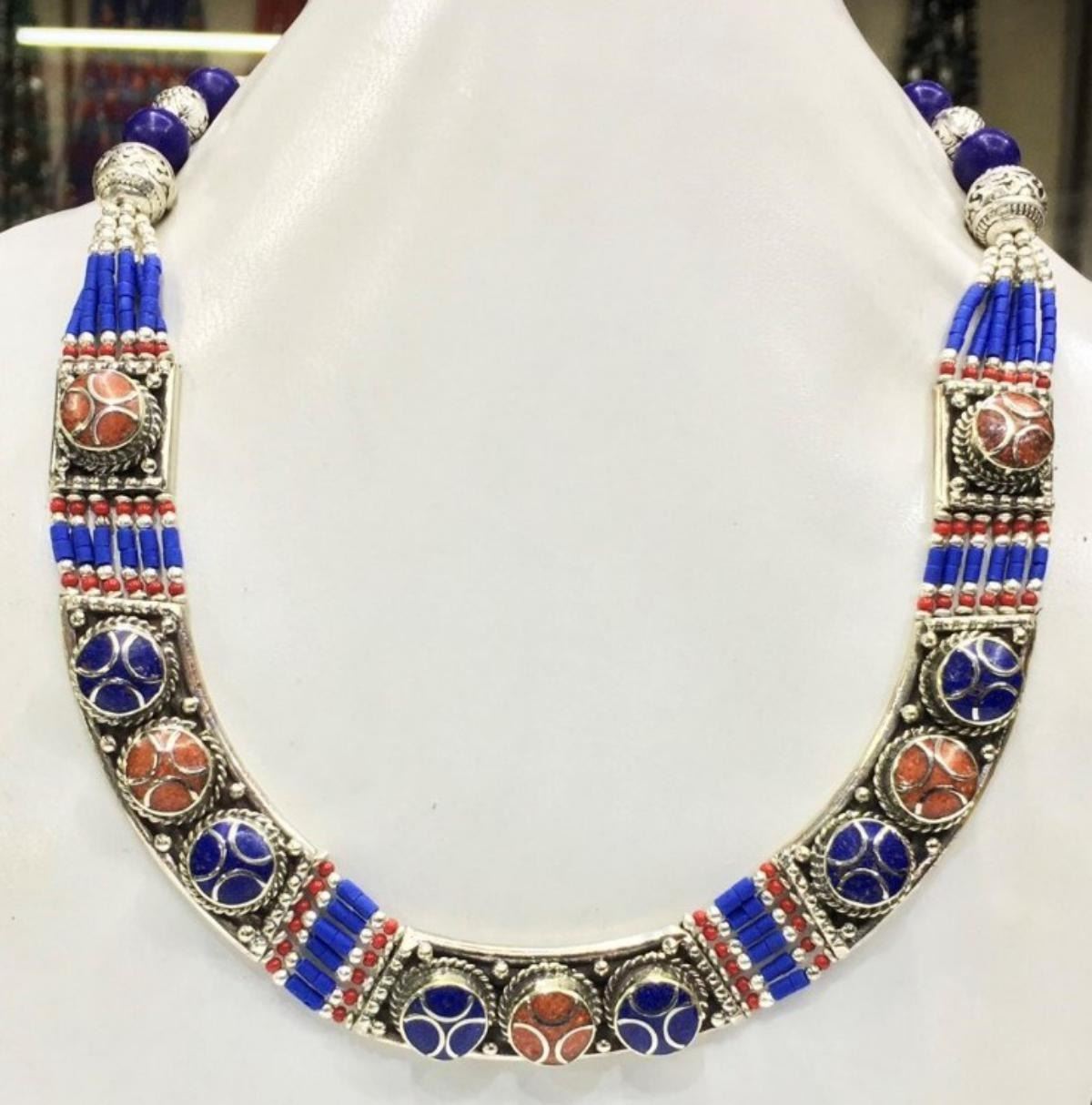 Tibet Natural Stone Hand Made Lapiz Lazuli & Coral Necklace ......;This elegant large Necklace was handcrafted in Tibet, the home of exquisite jewelry craftsmanship. It was skillfully made with large natural lapiz Lazuli & coral, each in a deep Tibetan Silver setting. and balance the design perfectly.”””Note- All stones in this necklace are Natural.....guaranteed....Vintage look but necklace is brand new.