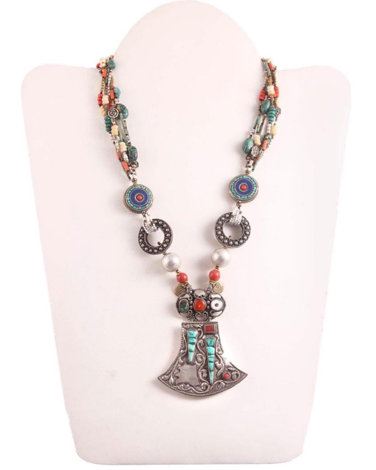 Tibet Natural Stone Hand Made Turquoise, Coral Necklace.......This elegant large Necklace was handcrafted in Tibet, the home of exquisite jewelry craftsmanship. It was skillfully made with large natural Turquoise, each in a deep Tibetan Silver setting. and balance the design perfectly. Turquoise is used virtually worldwide for jewelry making, and is highly prized for its brilliant colors, which vary from mine to mine. The distinctive webbing patterns and variations of color in the stones on this wonderful piece are typical of the natural Turquoise found throughout much of the Himalayan region, where Turquoise has been used in jewelry-making since centuries.”””Note- All stones in this necklace are Natural.....Guaranteed....Vintage look but necklace is brand new.Note- (Handcrafted/Handmade in Tibet)