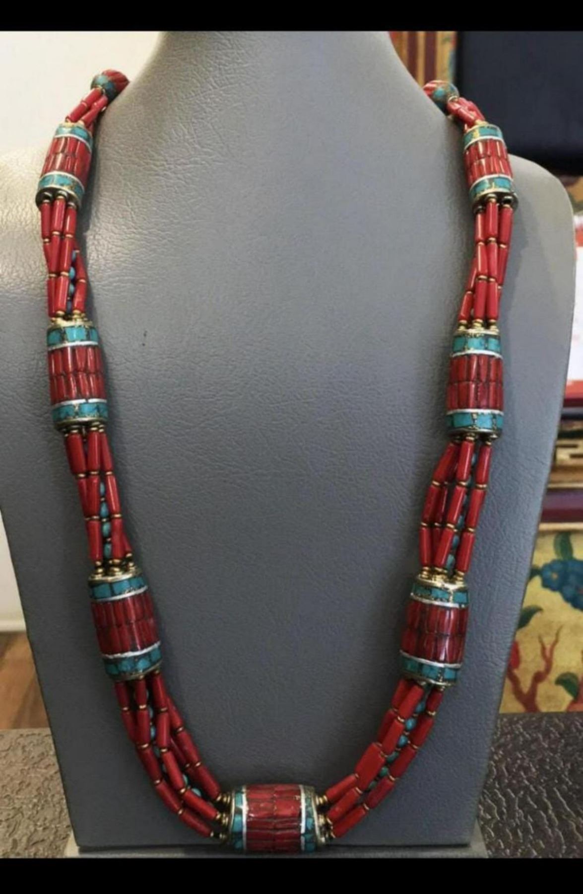 Tibet Natural Stone Hand Made Turquoise, Coral Necklace......;This elegant large Necklace was handcrafted in Tibet, the home of exquisite jewelry craftsmanship. It was skillfully made with large natural Turquoise, each in a deep Tibetan Silver setting. and balance the design perfectly. Turquoise is used virtually worldwide for jewelry making, and is highly prized for its brilliant colors, which vary from mine to mine. The distinctive webbing patterns and variations of color in the stones on this wonderful piece are typical of the natural Turquoise found throughout much of the Himalayan region, where Turquoise has been used in jewelry-making since centuries.”””Note- All stones in this necklace are Natural.....Guranteed....Vintage look but necklace is brand new.(Handcrafted & made in Tibet)