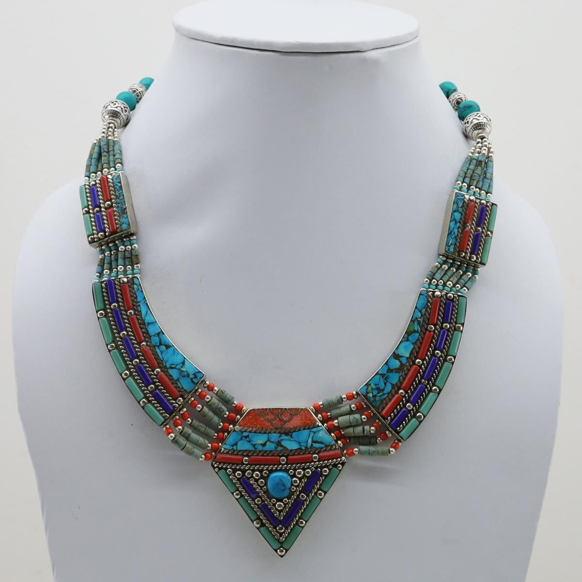 Tibet Natural Stone Hand Made Turquoise, lapiz lazuli & Coral Necklace......;This elegant large Necklace was handcrafted in Tibet, the home of exquisite jewelry craftsmanship. It was skillfully made with large natural Turquoise, each in a deep Tibetan Silver setting. and balance the design perfectly. Turquoise is used virtually worldwide for jewelry making, and is highly prized for its brilliant colors, which vary from mine to mine. The distinctive webbing patterns and variations of color in the stones on this wonderful piece are typical of the natural Turquoise found throughout much of the Himalayan region, where Turquoise has been used in jewelry-making since centuries.