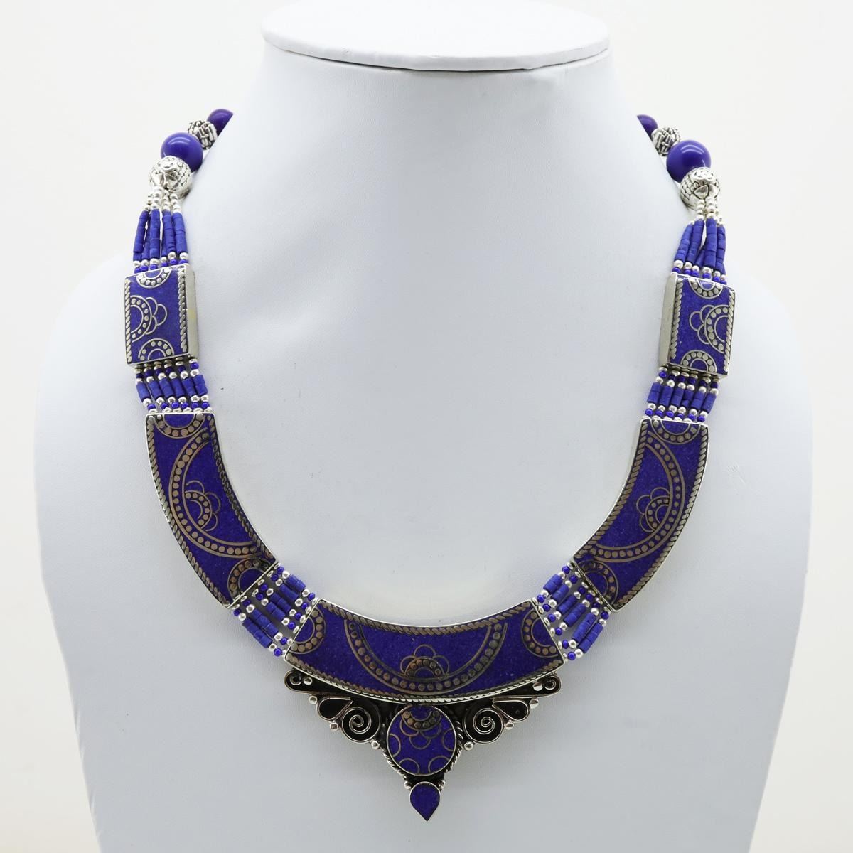 Tibet Natural Stone Hand Made Lapiz Lazuli Necklace.......This elegant large Necklace was handcrafted in Tibet, the home of exquisite jewelry craftsmanship. It was skillfully made with large natural lapiz lazuli , and balance the design perfectly. The distinctive webbing patterns and variations of color in the stones on this wonderful piece are typical of the natural ..Vintage look but necklace is brand new.Note- (Handcrafted/Handmade in Tibet)