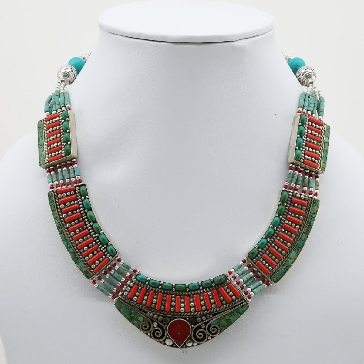 Tibet Natural Stone Hand Made Turquoise & Coral Necklace......;This elegant large Necklace was handcrafted in Tibet, the home of exquisite jewelry craftsmanship. It was skillfully made with large natural Turquoise, each in a deep Tibetan Silver setting. and balance the design perfectly. Turquoise is used virtually worldwide for jewelry making, and is highly prized for its brilliant colors, which vary from mine to mine. The distinctive webbing patterns and variations of color in the stones on this wonderful piece are typical of the natural Turquoise found throughout much of the Himalayan region, where Turquoise has been used in jewelry-making since centuries.