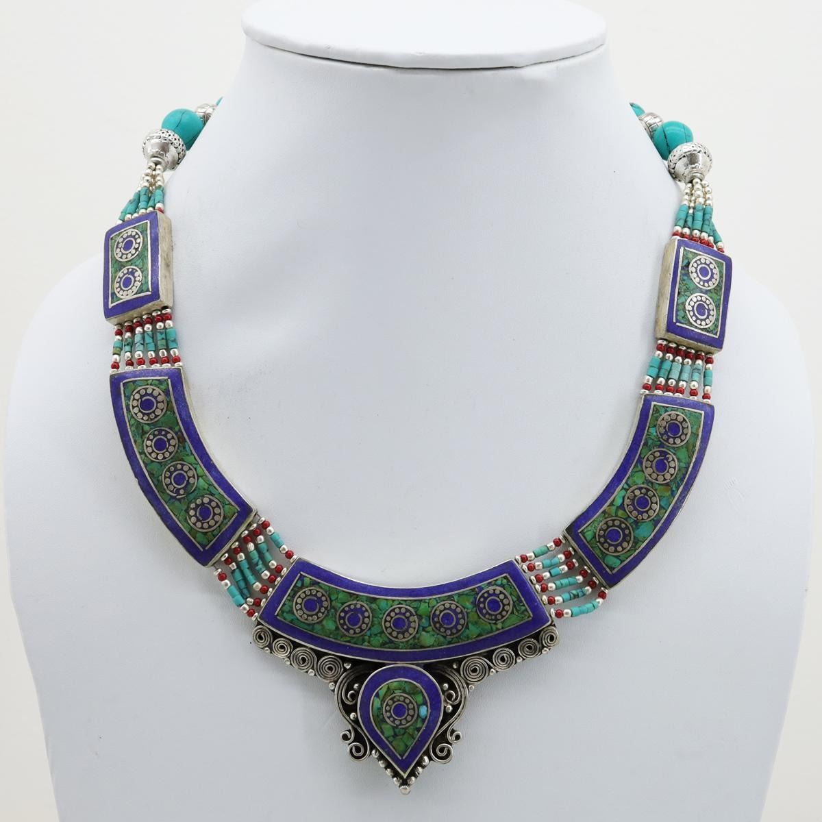 Tibet Natural Stone Hand Made Turquoise, Coral Necklace & Lapiz Lazuli.......This elegant large Necklace was handcrafted in Tibet, the home of exquisite jewelry craftsmanship. It was skillfully made with large natural Turquoise, each in a deep Tibetan Silver setting. and balance the design perfectly. Turquoise is used virtually worldwide for jewelry making, and is highly prized for its brilliant colors, which vary from mine to mine. The distinctive webbing patterns and variations of color in the stones on this wonderful piece are typical of the natural Turquoise found throughout much of the Himalayan region, where Turquoise has been used in jewelry-making since centuries.Note- All stones in this necklace are Natural.....Guaranteed....Vintage look but necklace is brand new.Note- (Handcrafted/Handmade in Tibet)