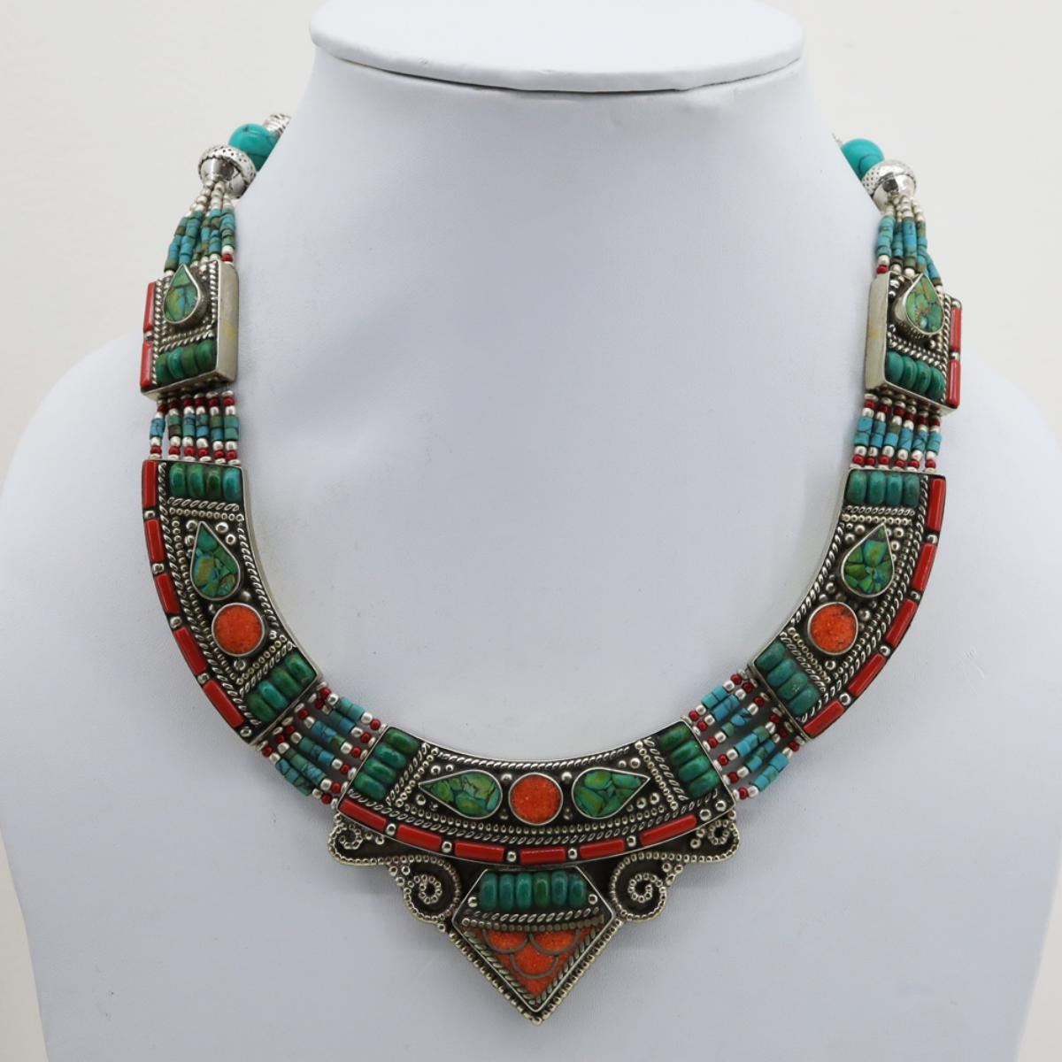 Tibet Natural Stone Hand Made Turquoise, Coral Necklace......;This elegant large Necklace was handcrafted in Tibet, the home of exquisite jewelry craftsmanship. It was skillfully made with large natural Turquoise, each in a deep Tibetan Silver setting. and balance the design perfectly. Turquoise is used virtually worldwide for jewelry making, and is highly prized for its brilliant colors, which vary from mine to mine. The distinctive webbing patterns and variations of color in the stones on this wonderful piece are typical of the natural Turquoise found throughout much of the Himalayan region, where Turquoise has been used in jewelry-making since centuries.Note- All stones in this necklace are Natural.....Guranteed....Vintage look but necklace is brand new.(Handcrafted & made in Tibet)