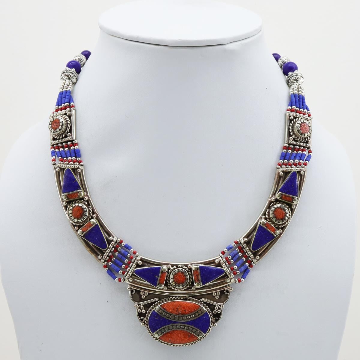 Tibet Natural Stone Hand Made coral & Lapiz Lazuli Necklace.......This elegant large Necklace was handcrafted in Tibet, the home of exquisite jewelry craftsmanship. It was skillfully made with large natural lapiz lazuli , and balance the design perfectly. The distinctive webbing patterns and variations of color in the stones on this wonderful piece are typical of the natural ..Vintage look but necklace is brand new.Note- (Handcrafted/Handmade in Tibet)