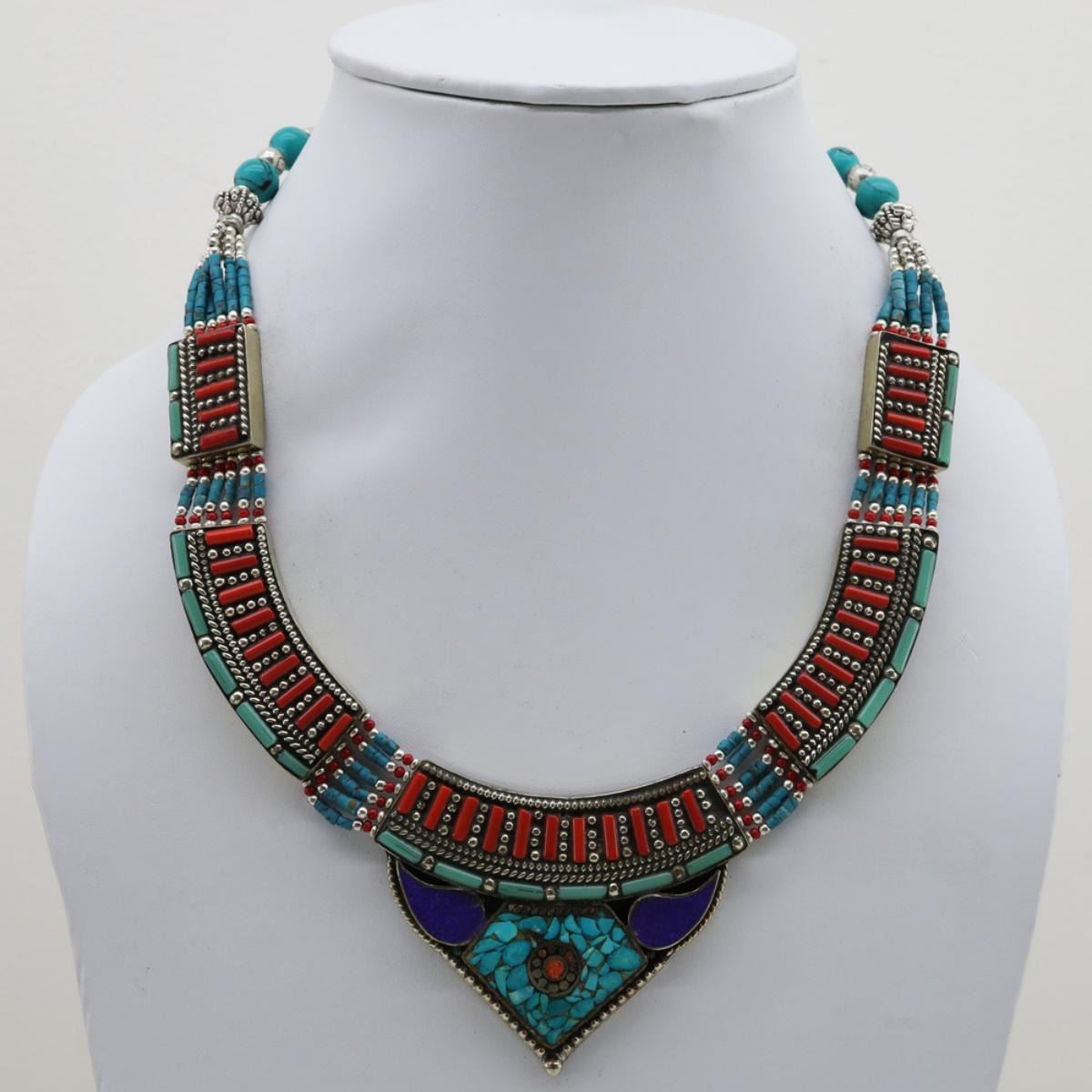 Natural Stone Hand Made Turquoise, Coral & Lapiz Lazuli necklace.......This elegant large Necklace was handcrafted in Tibet, the home of exquisite jewelry craftsmanship. It was skillfully made with large natural Turquoise, each in a deep Tibetan Silver setting. and balance the design perfectly. Turquoise is used virtually worldwide for jewelry making, and is highly prized for its brilliant colors, which vary from mine to mine. The distinctive webbing patterns and variations of color in the stones on this wonderful piece are typical of the natural Turquoise found throughout much of the Himalayan region, where Turquoise has been used in jewelry-making since centuries.???Note- All stones in this necklace are Natural.....Guaranteed....Vintage look but necklace is brand new.Note- (Handcrafted/Handmade in Tibet)
