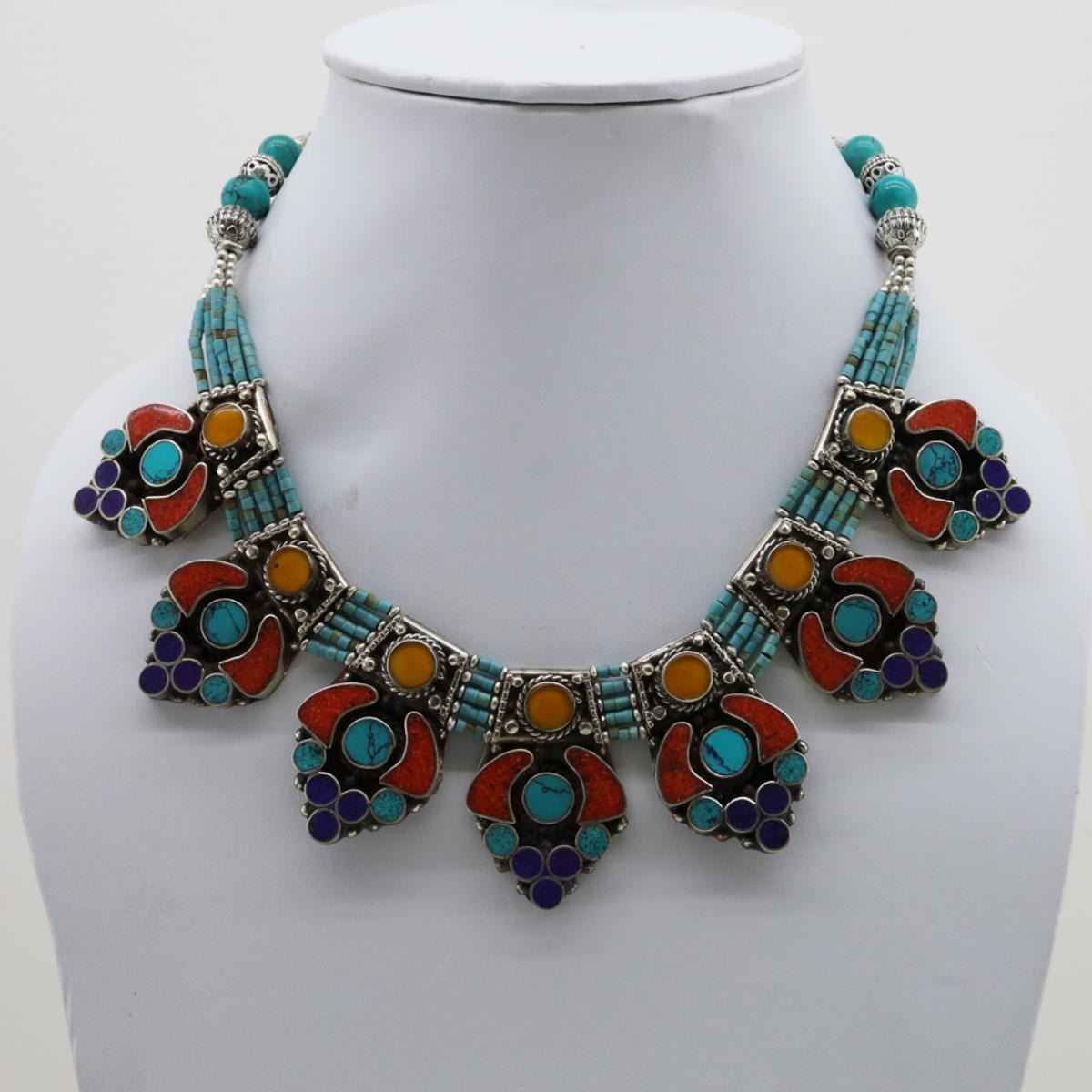 Tibet Natural Stone Hand Made Turquoise,Lapiz lazuli & Coral Necklace......;This elegant large Necklace was handcrafted in Tibet, the home of exquisite jewelry craftsmanship. It was skillfully made with large natural Turquoise, each in a deep Tibetan Silver setting. and balance the design perfectly. Turquoise is used virtually worldwide for jewelry making, and is highly prized for its brilliant colors, which vary from mine to mine. The distinctive webbing patterns and variations of color in the stones on this wonderful piece are typical of the natural Turquoise found throughout much of the Himalayan region, where Turquoise has been used in jewelry-making since centuries.