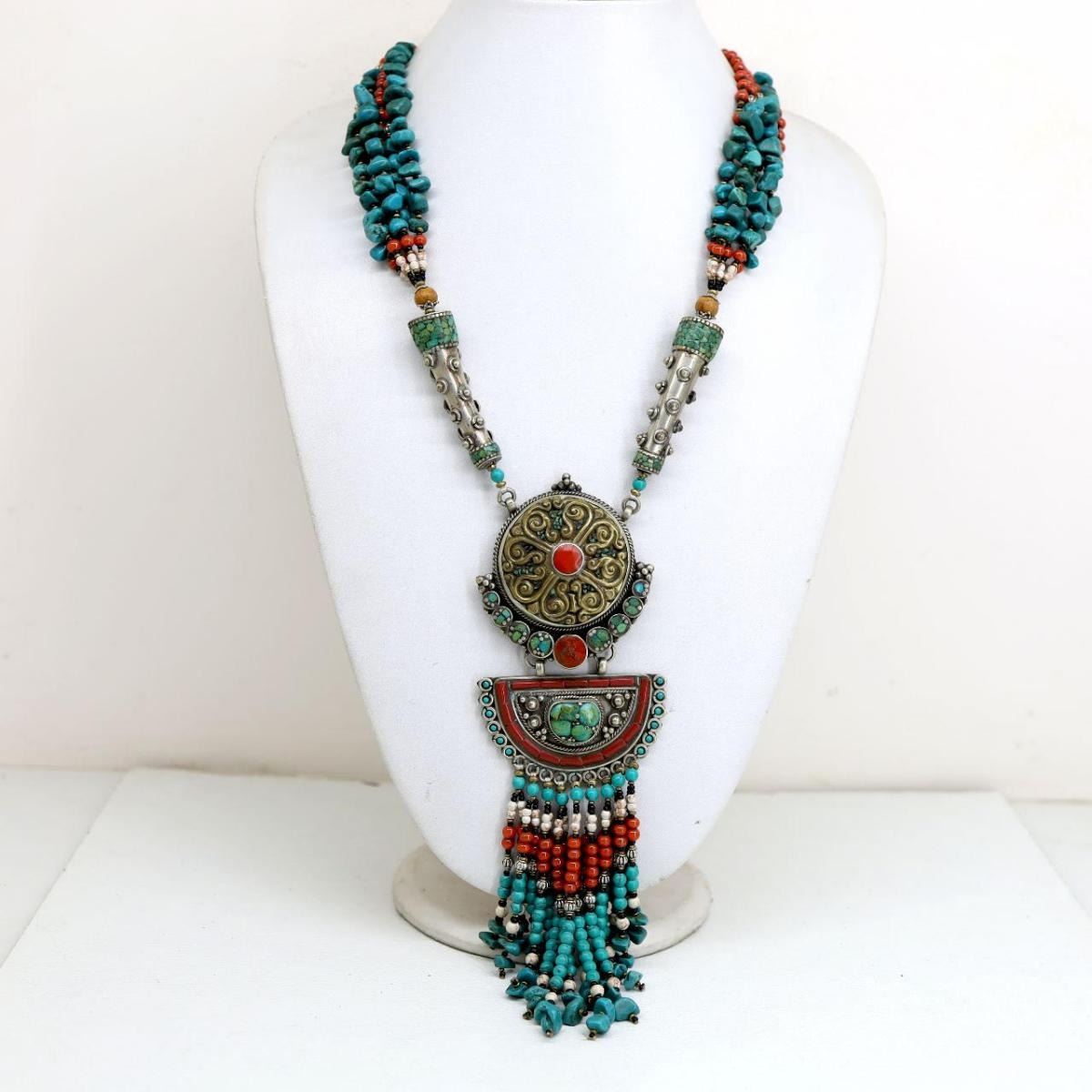Tibet Natural Stone Hand Made Turquoise, Coral Necklace......;This elegant large Necklace was handcrafted in Tibet, the home of exquisite jewelry craftsmanship. It was skillfully made with large natural Turquoise, each in a deep Tibetan Silver setting. and balance the design perfectly. Turquoise is used virtually worldwide for jewelry making, and is highly prized for its brilliant colors, which vary from mine to mine. The distinctive webbing patterns and variations of color in the stones on this wonderful piece are typical of the natural Turquoise found throughout much of the Himalayan region, where Turquoise has been used in jewelry-making since centuries.