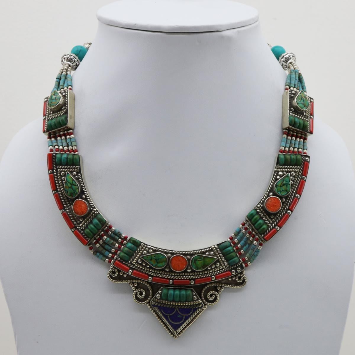 Tibet Natural Stone Hand Made Turquoise & Coral Necklace......;This elegant large Necklace was handcrafted in Tibet, the home of exquisite jewelry craftsmanship. It was skillfully made with large natural Turquoise, each in a deep Tibetan Silver setting. and balance the design perfectly. Turquoise is used virtually worldwide for jewelry making, and is highly prized for its brilliant colors, which vary from mine to mine. The distinctive webbing patterns and variations of color in the stones on this wonderful piece are typical of the natural Turquoise found throughout much of the Himalayan region, where Turquoise has been used in jewelry-making since centuries.