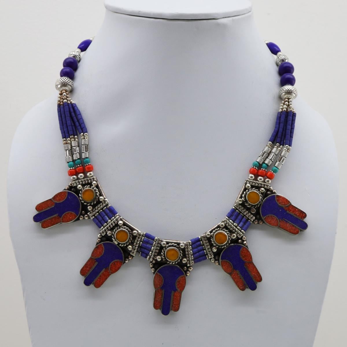 Tibet Natural Stone Hand Made coral & Lapiz Lazuli Necklace.......This elegant large Necklace was handcrafted in Tibet, the home of exquisite jewelry craftsmanship. It was skillfully made with large natural lapiz lazuli , and balance the design perfectly. The distinctive webbing patterns and variations of color in the stones on this wonderful piece are typical of the natural ..Vintage look but necklace is brand new.Note- (Handcrafted/Handmade in Tibet)