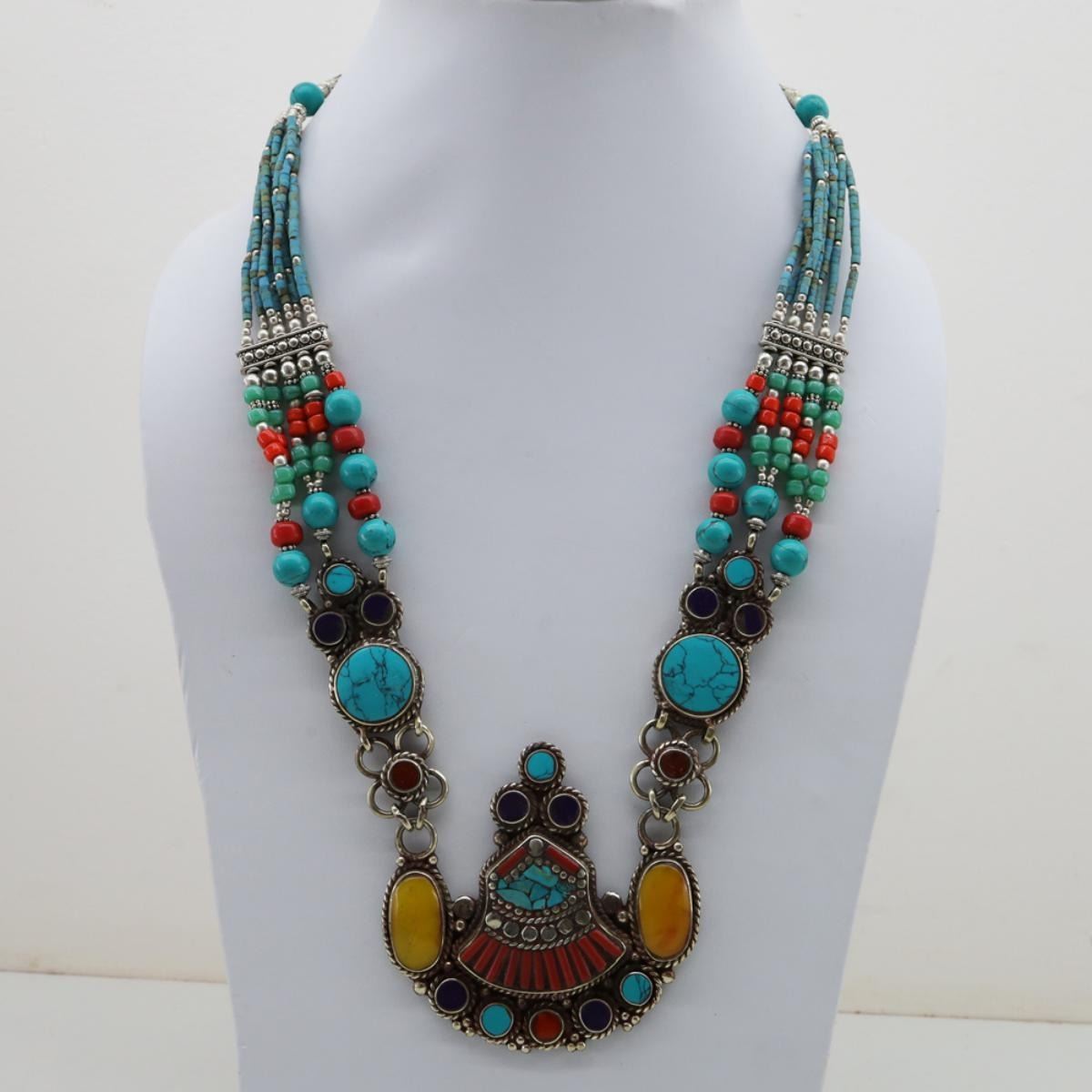 Tibet Natural Stone Tribal Queen Royal Necklace,This elegant large Necklace was handcrafted in Tibet, the home of exquisite jewelry craftsmanship. It was skillfully made with large natural Turquoise, each in a deep Tibetan Silver setting. and balance the design perfectly. Turquoise is used virtually worldwide for jewelry making, and is highly prized for its brilliant colors, which vary from mine to mine. The distinctive webbing patterns and variations of color in the stones on this wonderful piece are typical of the natural Turquoise found throughout much of the Himalayan region, where Turquoise has been used in jewelry-making since centuries.??????All stones in this necklace are Natural.....Guaranteed....Vintage look but necklace is brand new.Note- (Handcrafted/Handmade in Tibet)
