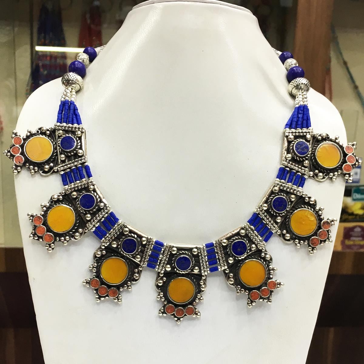 Tibet Natural Stone Hand Made coral & Lapiz Lazuli Necklace.......This elegant large Necklace was handcrafted in Tibet, the home of exquisite jewelry craftsmanship. It was skillfully made with large natural lapiz lazuli , and balance the design perfectly. The distinctive webbing patterns and variations of color in the stones on this wonderful piece are typical of the natural ..Vintage look but necklace is brand new.Note- (Handcrafted/Handmade in Tibet)