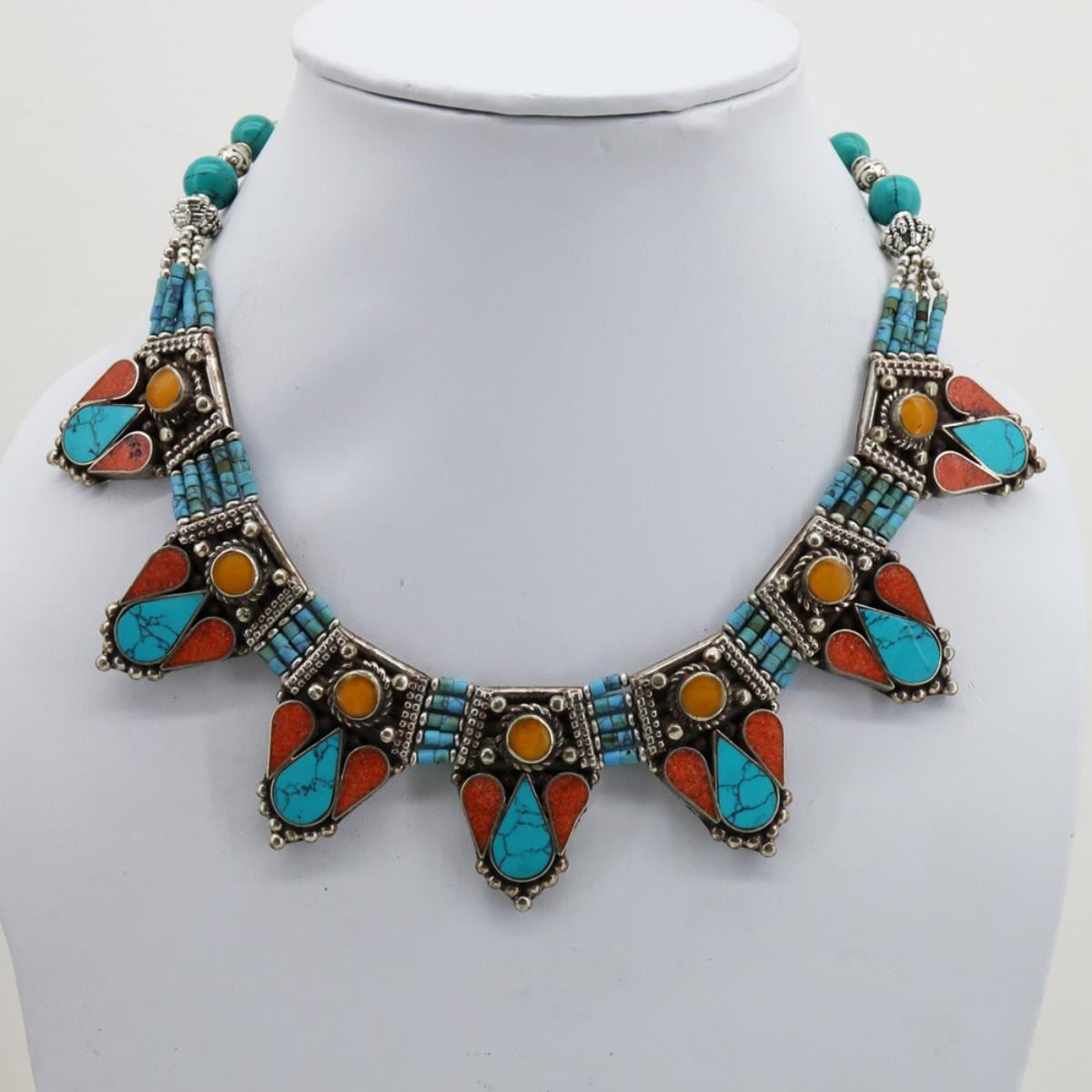 Tibet Natural Stone Hand Made Turquoise, Coral Necklace......;This elegant large Necklace was handcrafted in Tibet, the home of exquisite jewelry craftsmanship. It was skillfully made with large natural Turquoise, each in a deep Tibetan Silver setting. and balance the design perfectly. Turquoise is used virtually worldwide for jewelry making, and is highly prized for its brilliant colors, which vary from mine to mine. The distinctive webbing patterns and variations of color in the stones on this wonderful piece are typical of the natural Turquoise found throughout much of the Himalayan region, where Turquoise has been used in jewelry-making since centuries.???Note- All stones in this necklace are Natural.....guaranteed....Vintage look but necklace is brand new.(Handcrafted & made in Tibet)