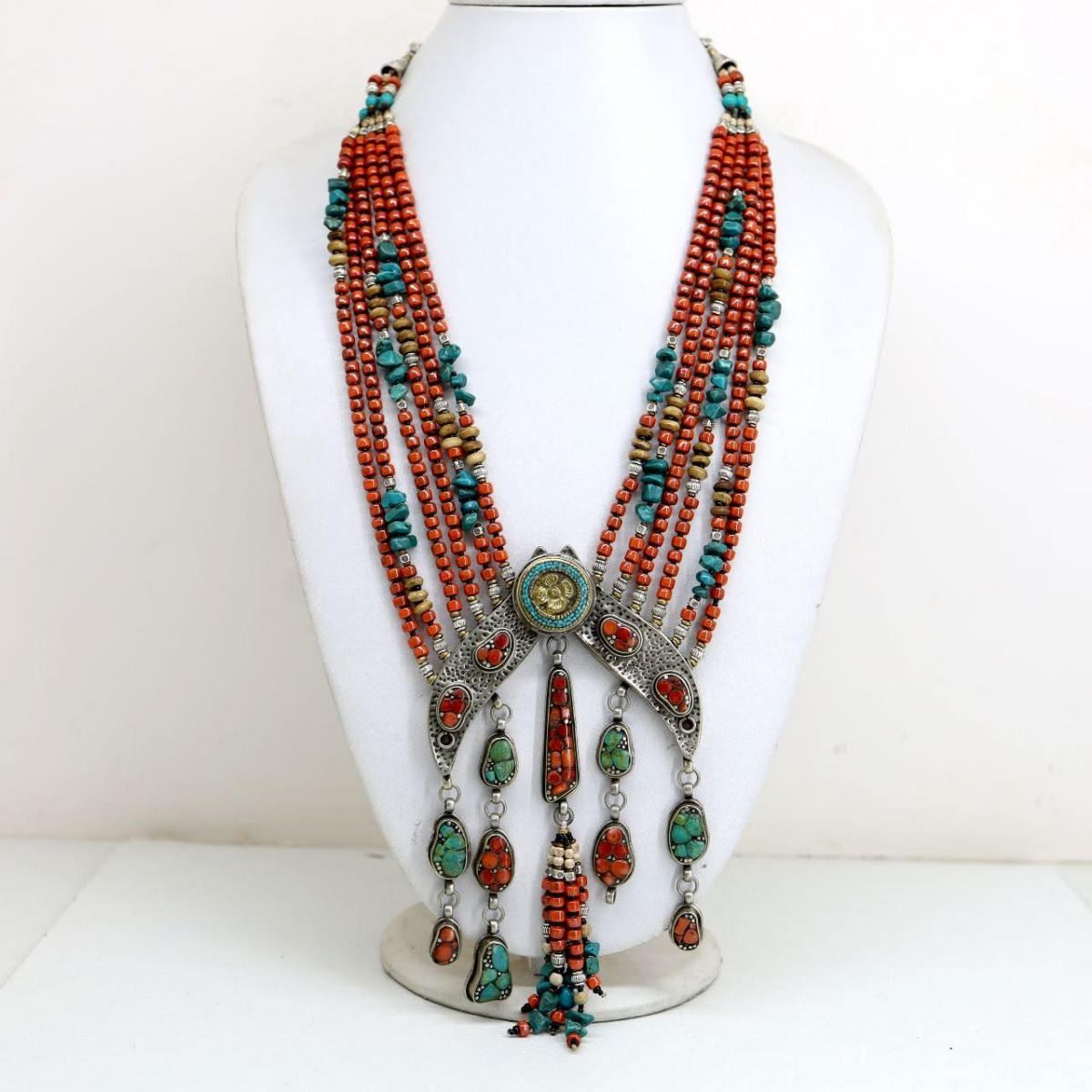 Natural Stone Hand Made Turquoise, Coral Necklace.......This elegant large Necklace was handcrafted in Tibet, the home of exquisite jewelry craftsmanship. It was skillfully made with large natural Turquoise, each in a deep Tibetan Silver setting. and balance the design perfectly. Turquoise is used virtually worldwide for jewelry making, and is highly prized for its brilliant colors, which vary from mine to mine. The distinctive webbing patterns and variations of color in the stones on this wonderful piece are typical of the natural Turquoise found throughout much of the Himalayan region, where Turquoise has been used in jewelry-making since centuries.Note- All stones in this necklace are Natural.....Guaranteed....Vintage look but necklace is brand new.Note- (Handcrafted/Handmade in Tibet)