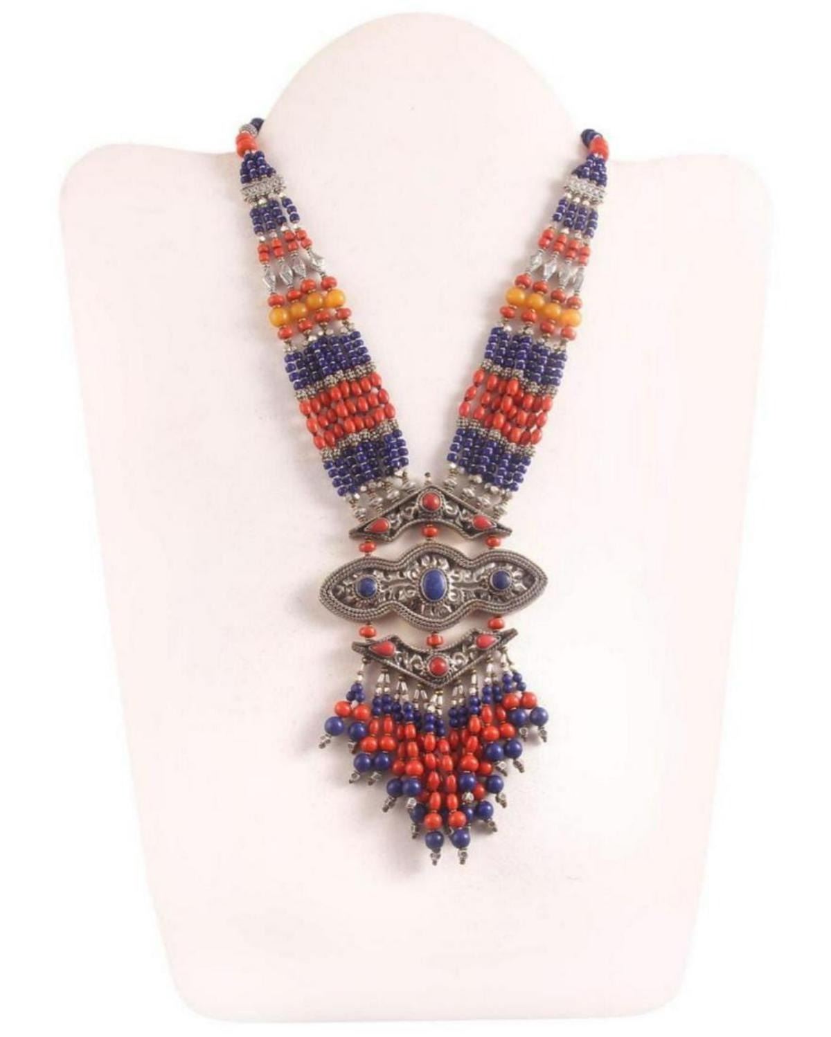 Tibet Natural Stone Hand Made Coral Necklace & Lapiz Lazuli.......This elegant large Necklace was handcrafted in Tibet, the home of exquisite jewelry craftsmanship. It was skillfully made with large natural lapiz lazuli and coral, and balance the design perfectly. The distinctive webbing patterns and variations of color in the stones on this wonderful piece are typical of the natural ..Vintage look but necklace is brand new.Note- (Handcrafted/Handmade in Tibet)
