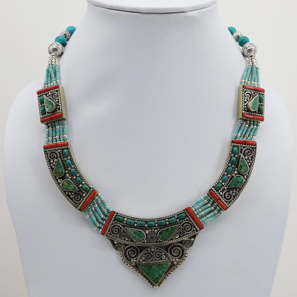 Tibet Natural Stone Hand Made Turquoise, Coral Necklace......;This elegant large Necklace was handcrafted in Tibet, the home of exquisite jewelry craftsmanship. It was skillfully made with large natural Turquoise, each in a deep Tibetan Silver setting. and balance the design perfectly. Turquoise is used virtually worldwide for jewelry making, and is highly prized for its brilliant colors, which vary from mine to mine. The distinctive webbing patterns and variations of color in the stones on this wonderful piece are typical of the natural Turquoise found throughout much of the Himalayan region, where Turquoise has been used in jewelry-making since centuries.???Note- All stones in this necklace are Natural.....guaranteed....Vintage look but necklace is brand new.(Handcrafted & made in Tibet)