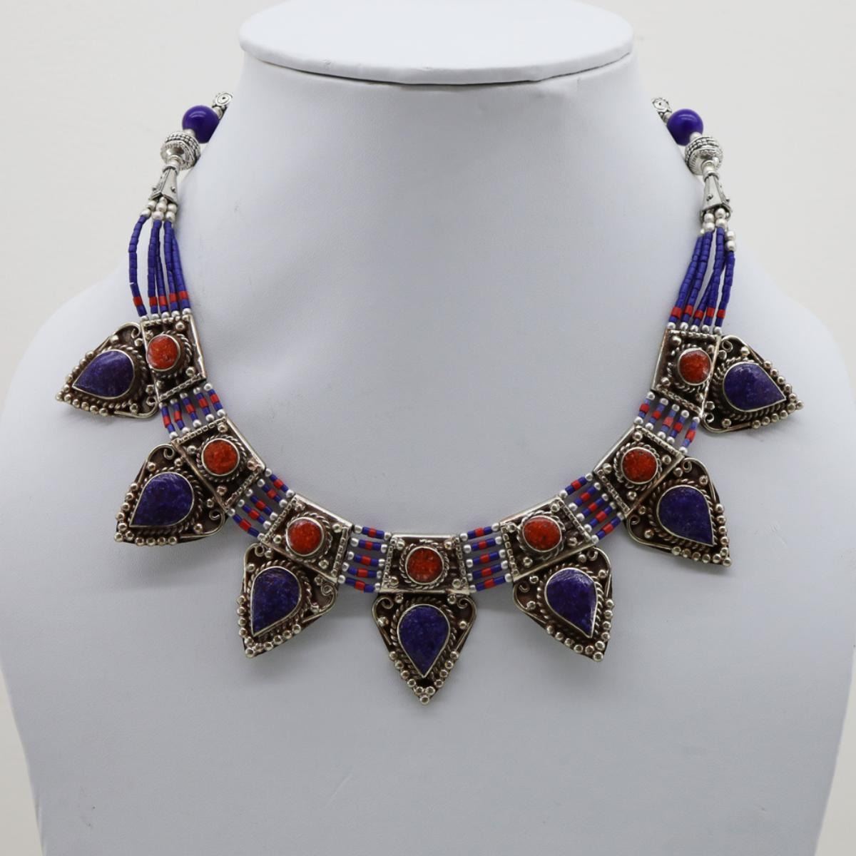 Tibet Natural Stone Hand Made coral & Lapiz Lazuli Necklace.......This elegant large Necklace was handcrafted in Tibet, the home of exquisite jewelry craftsmanship. It was skillfully made with large natural lapiz lazuli , and balance the design perfectly. The distinctive webbing patterns and variations of color in the stones on this wonderful piece are typical of the natural ..Vintage look but necklace is brand new.Note- (Handcrafted/Handmade in Tibet)