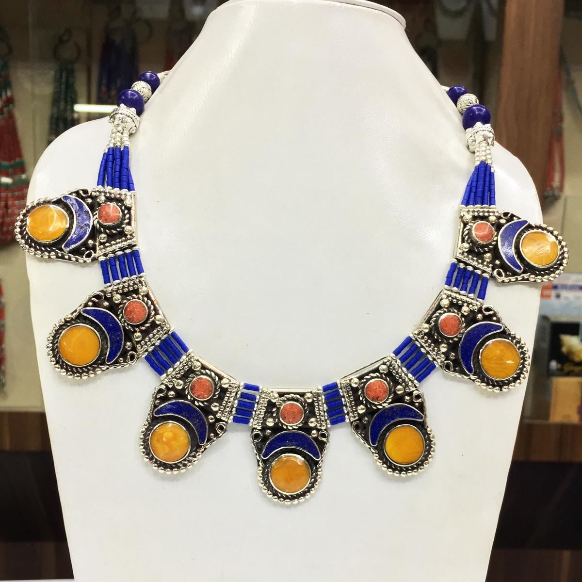 Tibet Natural Stone Hand Made Coral Necklace & Lapiz Lazuli.......This elegant large Necklace was handcrafted in Tibet, the home of exquisite jewelry craftsmanship. It was skillfully made with large natural lapiz lazuli and coral, and balance the design perfectly. The distinctive webbing patterns and variations of color in the stones on this wonderful piece are typical of the natural ..Vintage look but necklace is brand new.Note- (Handcrafted/Handmade in Tibet)