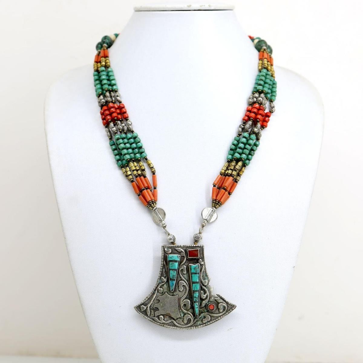 This elegant large Necklace was handcrafted in Tibet, the home of exquisite jewelry craftsmanship. It was skillfully made with large natural Turquoise, each in a deep Tibetan Silver setting. and balance the design perfectly. Turquoise is used virtually worldwide for jewelry making, and is highly prized for its brilliant colors, which vary from mine to mine. The distinctive webbing patterns and variations of color in the stones on this wonderful piece are typical of the natural Turquoise found throughout much of the Himalayan region, where Turquoise has been used in jewelry-making since centuries. All stones in this necklace are Natural.....Guaranteed....Vintage look but necklace is brand new.Note- (Handcrafted/Handmade in Tibet)