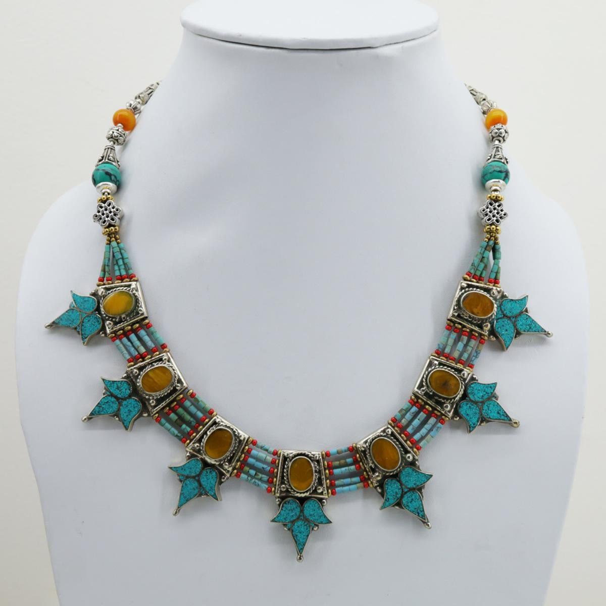 Tibet Natural Stone Hand Made Turquoise & Coral Necklace......;This elegant large Necklace was handcrafted in Tibet, the home of exquisite jewelry craftsmanship. It was skillfully made with large natural Turquoise, each in a deep Tibetan Silver setting. and balance the design perfectly. Turquoise is used virtually worldwide for jewelry making, and is highly prized for its brilliant colors, which vary from mine to mine. The distinctive webbing patterns and variations of color in the stones on this wonderful piece are typical of the natural Turquoise found throughout much of the Himalayan region, where Turquoise has been used in jewelry-making since centuries.