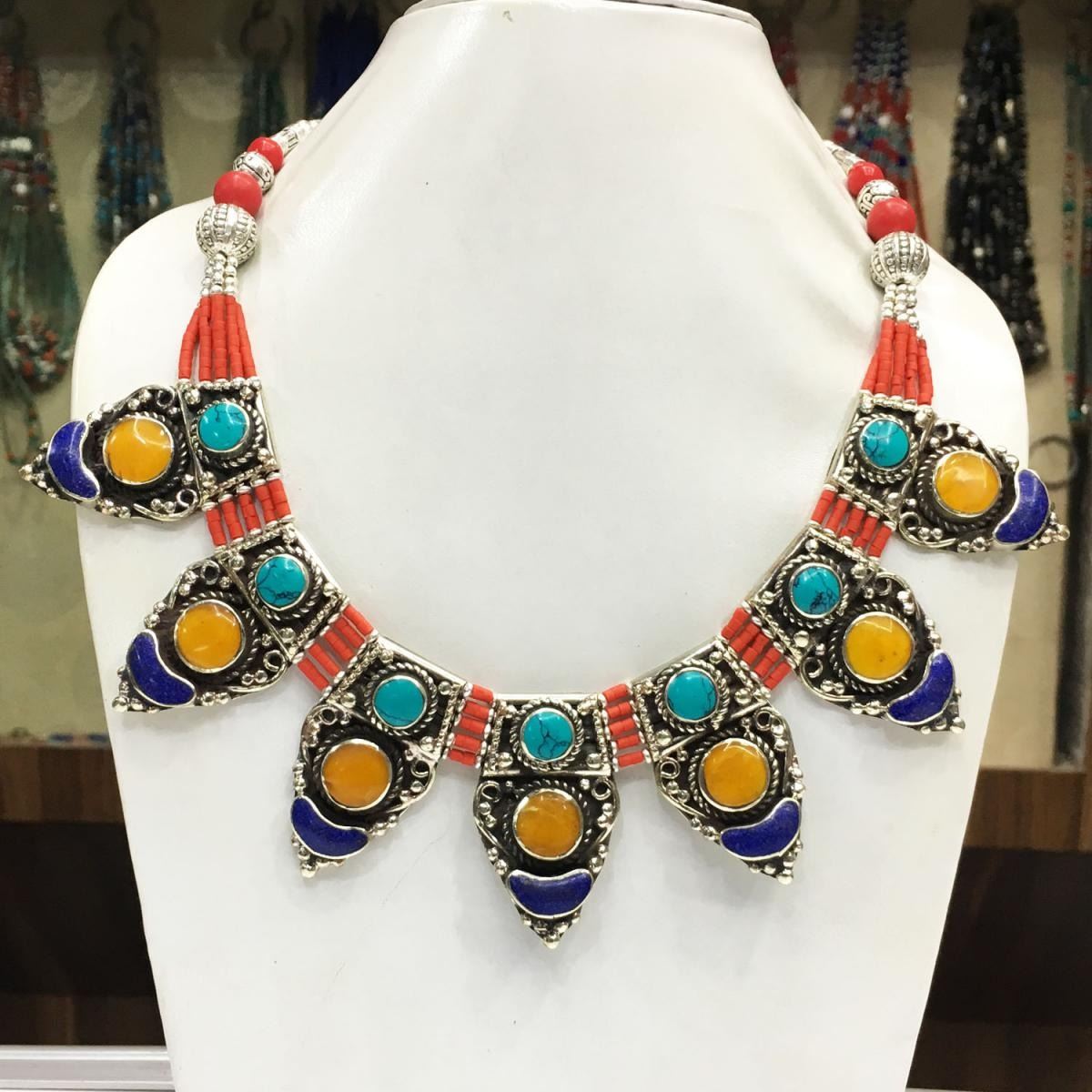Natural Stone Hand Made Turquoise, Coral & Lapiz Lazuli Necklace.......This elegant large Necklace was handcrafted in Tibet, the home of exquisite jewelry craftsmanship. It was skillfully made with large natural Turquoise, each in a deep Tibetan Silver setting. and balance the design perfectly. Turquoise is used virtually worldwide for jewelry making, and is highly prized for its brilliant colors, which vary from mine to mine. The distinctive webbing patterns and variations of color in the stones on this wonderful piece are typical of the natural Turquoise found throughout much of the Himalayan region, where Turquoise has been used in jewelry-making since centuries.???Note- All stones in this necklace are Natural.....Guaranteed....Vintage look but necklace is brand new.Note- (Handcrafted/Handmade in Tibet)