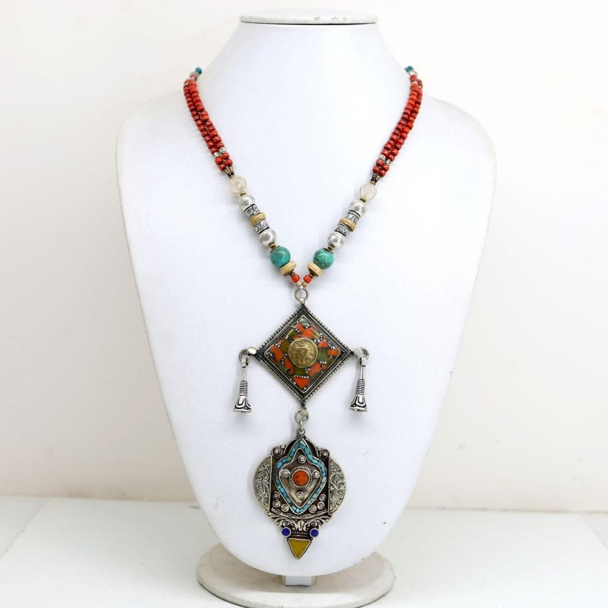 Natural Stone Hand Made Turquoise, Coral Necklace.......This elegant large Necklace was handcrafted in Tibet, the home of exquisite jewelry craftsmanship. It was skillfully made with large natural Turquoise, each in a deep Tibetan Silver setting. and balance the design perfectly. Turquoise is used virtually worldwide for jewelry making, and is highly prized for its brilliant colors, which vary from mine to mine. The distinctive webbing patterns and variations of color in the stones on this wonderful piece are typical of the natural Turquoise found throughout much of the Himalayan region, where Turquoise has been used in jewelry-making since centuries.Note- All stones in this necklace are Natural.....Guaranteed....Vintage look but necklace is brand new.Note- (Handcrafted/Handmade in Tibet)
