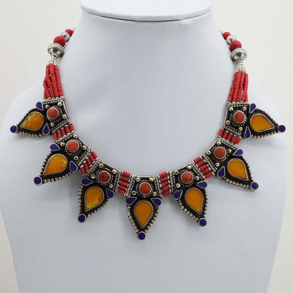 Tibet Natural Stone Hand Made coral & Lapiz Lazuli Necklace.......This elegant large Necklace was handcrafted in Tibet, the home of exquisite jewelry craftsmanship. It was skillfully made with large natural lapiz lazuli , and balance the design perfectly. The distinctive webbing patterns and variations of color in the stones on this wonderful piece are typical of the natural ..Vintage look but necklace is brand new.Note- (Handcrafted/Handmade in Tibet)