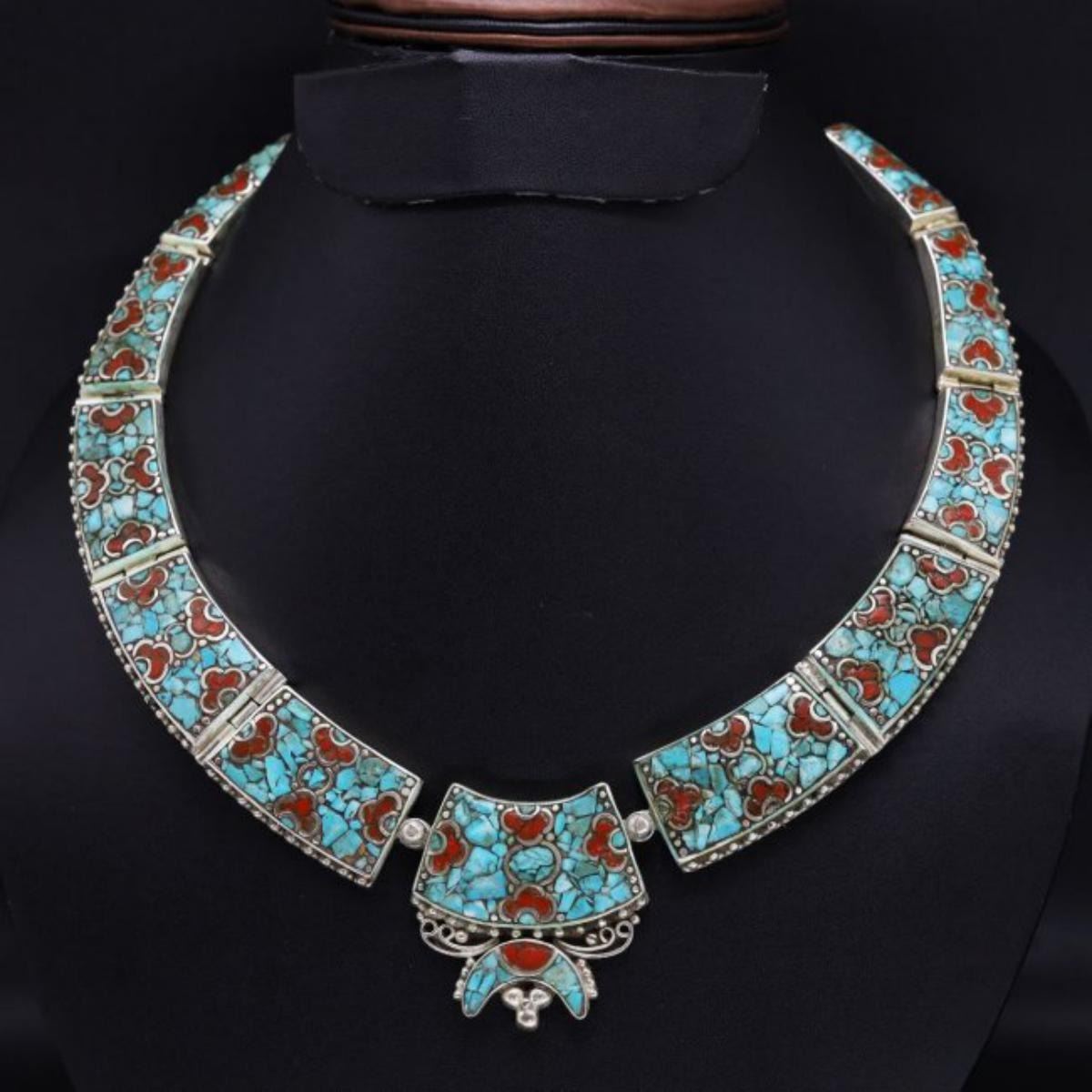 This elegant large Necklace was handcrafted in Tibet, the home of exquisite jewelry craftsmanship. It was skillfully made with large natural Turquoise, each in a deep Tibetan Silver setting. and balance the design perfectly. Turquoise is used virtually worldwide for jewelry making, and is highly prized for its brilliant colors, which vary from mine to mine. The distinctive webbing patterns and variations of color in the stones on this wonderful piece are typical of the natural Turquoise found throughout much of the Himalayan region, where Turquoise has been used in jewelry-making since centuries. All stones in this necklace are Natural.....Guaranteed....Vintage look but necklace is brand new.Note- (Handcrafted/Handmade in Tibet)