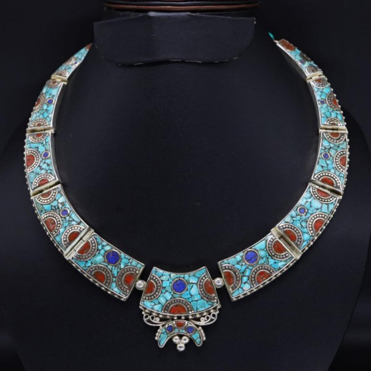 Tibet Natural Stone Hand Made Turquoise,Lapiz lazuli & Coral Necklace......;This elegant large Necklace was handcrafted in Tibet, the home of exquisite jewelry craftsmanship. It was skillfully made with large natural Turquoise, each in a deep Tibetan Silver setting. and balance the design perfectly. Turquoise is used virtually worldwide for jewelry making, and is highly prized for its brilliant colors, which vary from mine to mine. The distinctive webbing patterns and variations of color in the stones on this wonderful piece are typical of the natural Turquoise found throughout much of the Himalayan region, where Turquoise has been used in jewelry-making since centuries.