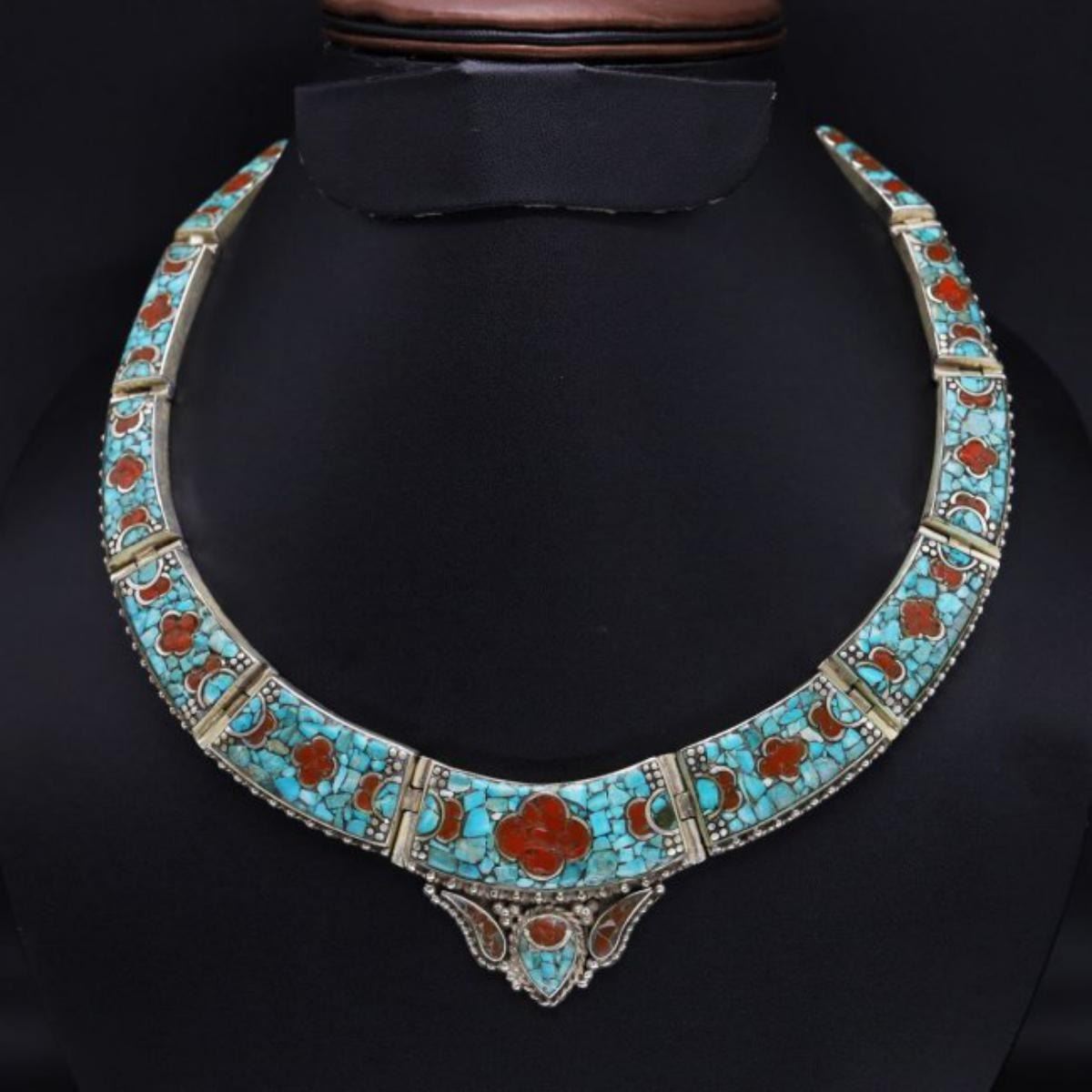This elegant large Necklace was handcrafted in Tibet, the home of exquisite jewelry craftsmanship. It was skillfully made with large natural Turquoise & Coral, each in a deep Tibetan Silver setting. and balance the design perfectly. Turquoise is used virtually worldwide for jewelry making, and is highly prized for its brilliant colors, which vary from mine to mine. The distinctive webbing patterns and variations of color in the stones on this wonderful piece are typical of the natural Turquoise found throughout much of the Himalayan region, where Turquoise has been used in jewelry-making since centuries. All stones in this necklace are Natural.....Guaranteed....Vintage look but necklace is brand new.Note- (Handcrafted/Handmade in Tibet)