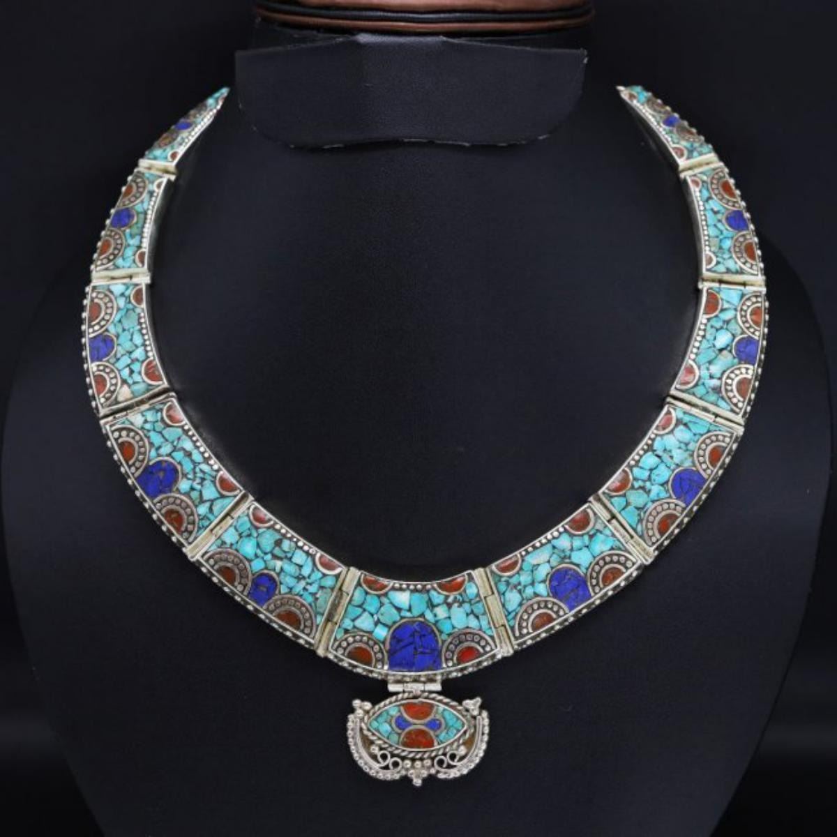 Tibet Natural Stone Hand Made Turquoise,Lapiz lazuli & Coral Necklace......;This elegant large Necklace was handcrafted in Tibet, the home of exquisite jewelry craftsmanship. It was skillfully made with large natural Turquoise, each in a deep Tibetan Silver setting. and balance the design perfectly. Turquoise is used virtually worldwide for jewelry making, and is highly prized for its brilliant colors, which vary from mine to mine. The distinctive webbing patterns and variations of color in the stones on this wonderful piece are typical of the natural Turquoise found throughout much of the Himalayan region, where Turquoise has been used in jewelry-making since centuries.