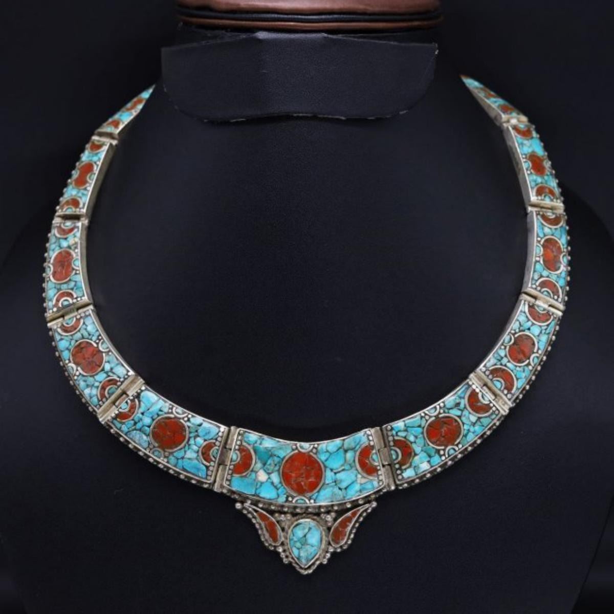 This elegant large Necklace was handcrafted in Tibet, the home of exquisite jewelry craftsmanship. It was skillfully made with large natural Turquoise, each in a deep Tibetan Silver setting. and balance the design perfectly. Turquoise is used virtually worldwide for jewelry making, and is highly prized for its brilliant colors, which vary from mine to mine. The distinctive webbing patterns and variations of color in the stones on this wonderful piece are typical of the natural Turquoise found throughout much of the Himalayan region, where Turquoise has been used in jewelry-making since centuries. All stones in this necklace are Natural.....Guaranteed....Vintage look but necklace is brand new.Note- (Handcrafted/Handmade in Tibet)