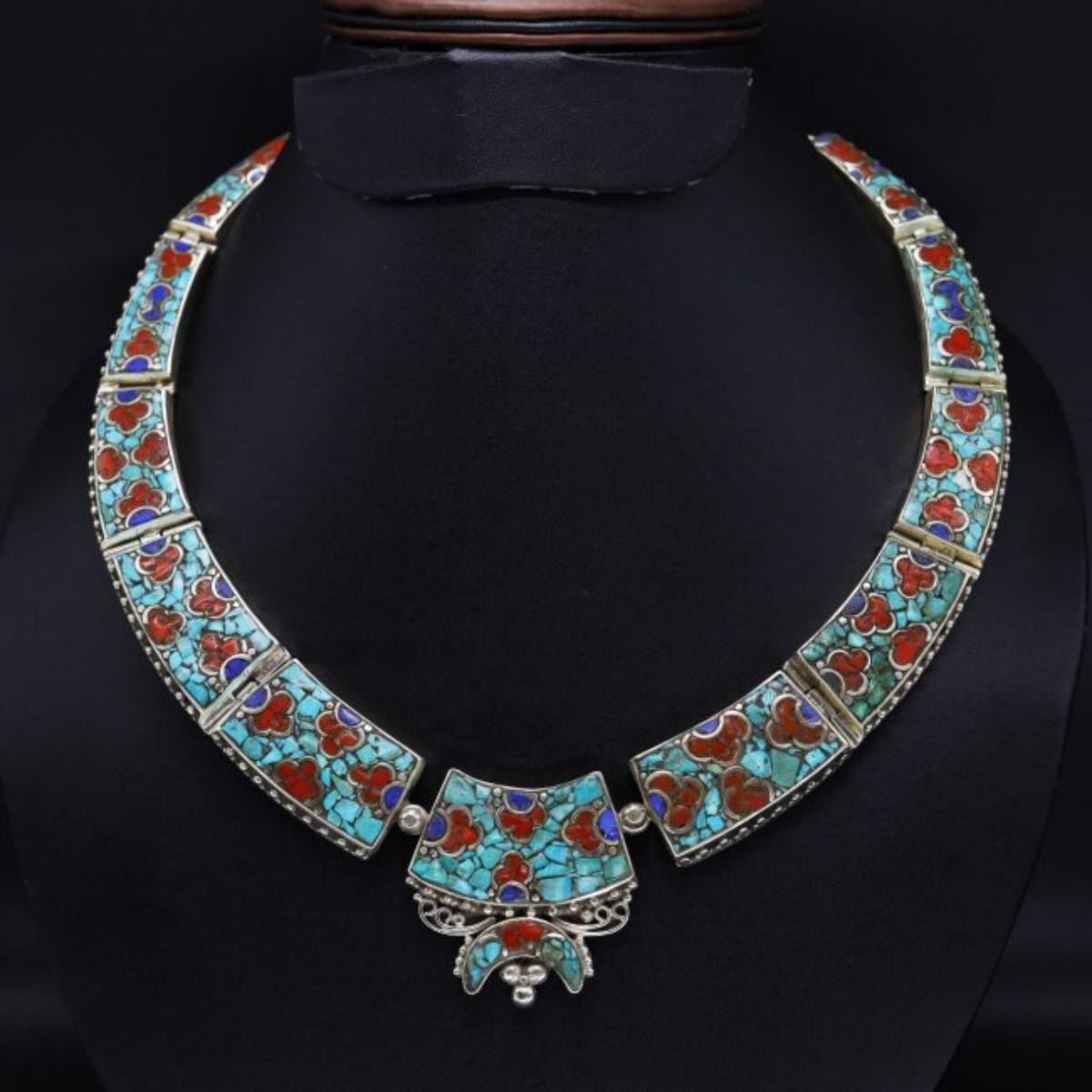 Tibet Natural Stone Hand Made Turquoise,Lapiz lazuli & Coral Necklace......;This elegant large Necklace was handcrafted in Tibet, the home of exquisite jewelry craftsmanship. It was skillfully made with large natural Turquoise, each in a deep Tibetan Silver setting. and balance the design perfectly. Turquoise is used virtually worldwide for jewelry making, and is highly prized for its brilliant colors, which vary from mine to mine. The distinctive webbing patterns and variations of color in the stones on this wonderful piece are typical of the natural Turquoise found throughout much of the Himalayan region, where Turquoise has been used in jewelry-making since centuries.