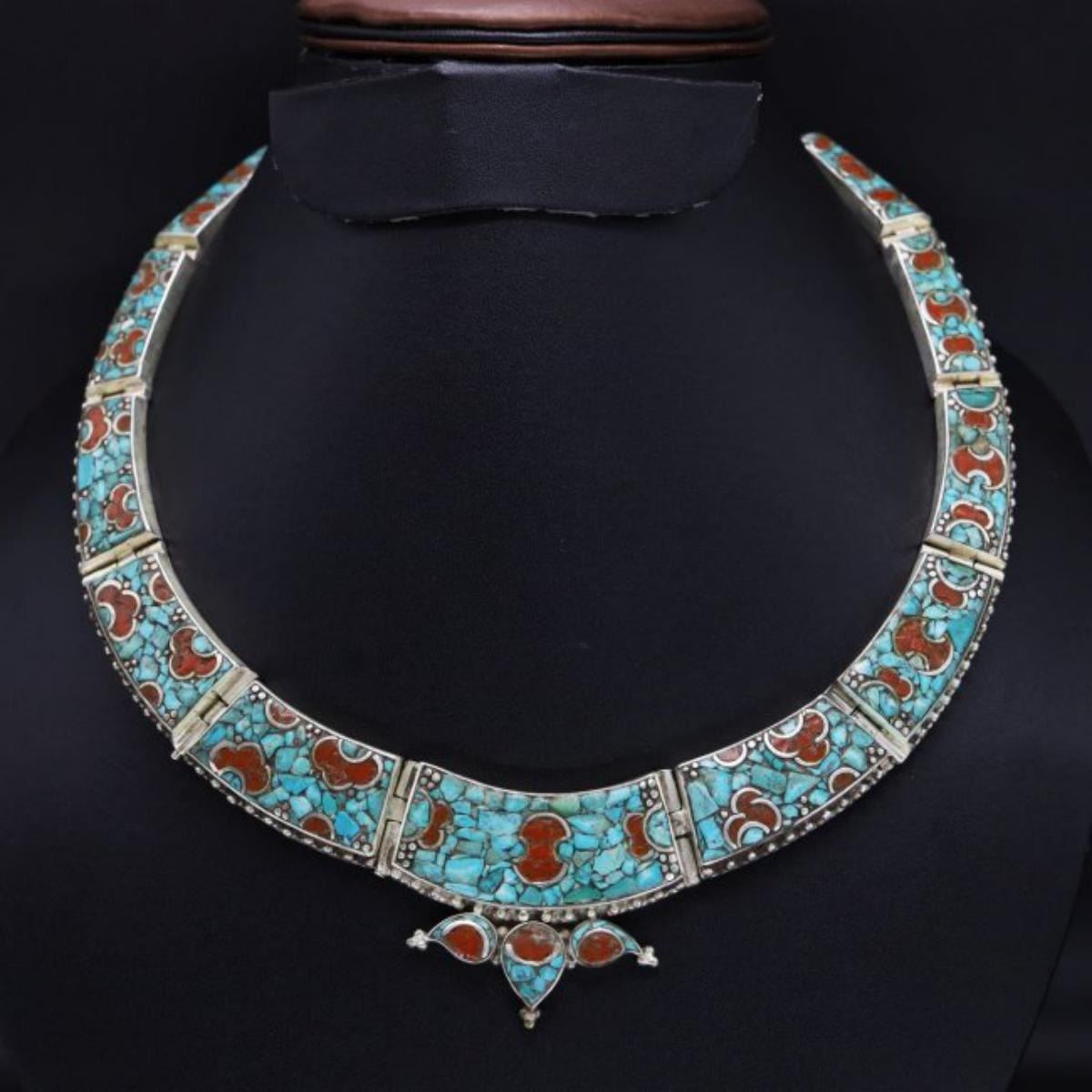 This elegant large Necklace was handcrafted in Tibet, the home of exquisite jewelry craftsmanship. It was skillfully made with large natural Turquoise, each in a deep Tibetan Silver setting. and balance the design perfectly. Turquoise is used virtually worldwide for jewelry making, and is highly prized for its brilliant colors, which vary from mine to mine. The distinctive webbing patterns and variations of color in the stones on this wonderful piece are typical of the natural Turquoise found throughout much of the Himalayan region, where Turquoise has been used in jewelry-making since centuries. All stones in this necklace are Natural.....Guaranteed....Vintage look but necklace is brand new.Note- (Handcrafted/Handmade in Tibet)
