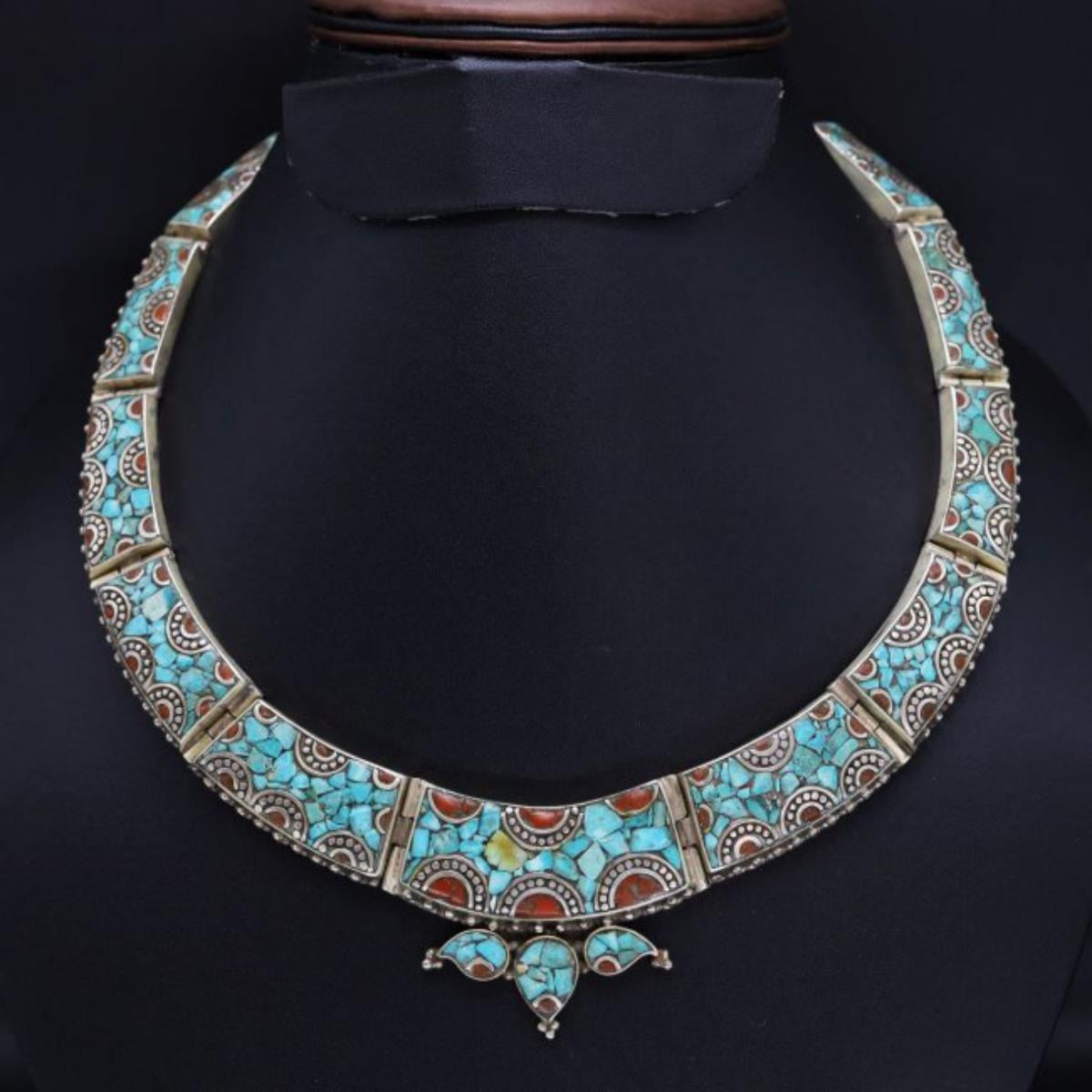 This elegant large Necklace was handcrafted in Tibet, the home of exquisite jewelry craftsmanship. It was skillfully made with large natural Turquoise, each in a deep Tibetan Silver setting. and balance the design perfectly. Turquoise is used virtually worldwide for jewelry making, and is highly prized for its brilliant colors, which vary from mine to mine. The distinctive webbing patterns and variations of color in the stones on this wonderful piece are typical of the natural Turquoise found throughout much of the Himalayan region, where Turquoise has been used in jewelry-making since centuries. All stones in this necklace are Natural.....Guaranteed....Vintage look but necklace is brand new.Note- (Handcrafted/Handmade in Tibet)