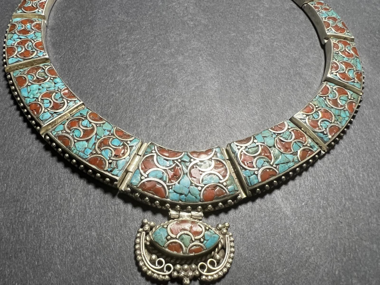 This elegant large Necklace was handcrafted in Tibet, the home of exquisite jewelry craftsmanship. It was skillfully made with large natural Turquoise & Coral, each in a deep Tibetan Silver setting. and balance the design perfectly. Turquoise is used virtually worldwide for jewelry making, and is highly prized for its brilliant colors, which vary from mine to mine. The distinctive webbing patterns and variations of color in the stones on this wonderful piece are typical of the natural Turquoise found throughout much of the Himalayan region, where Turquoise has been used in jewelry-making since centuries.??????All stones in this necklace are Natural.....Guaranteed....Vintage look but necklace is brand new.Note- (Handcrafted/Handmade in Tibet)
